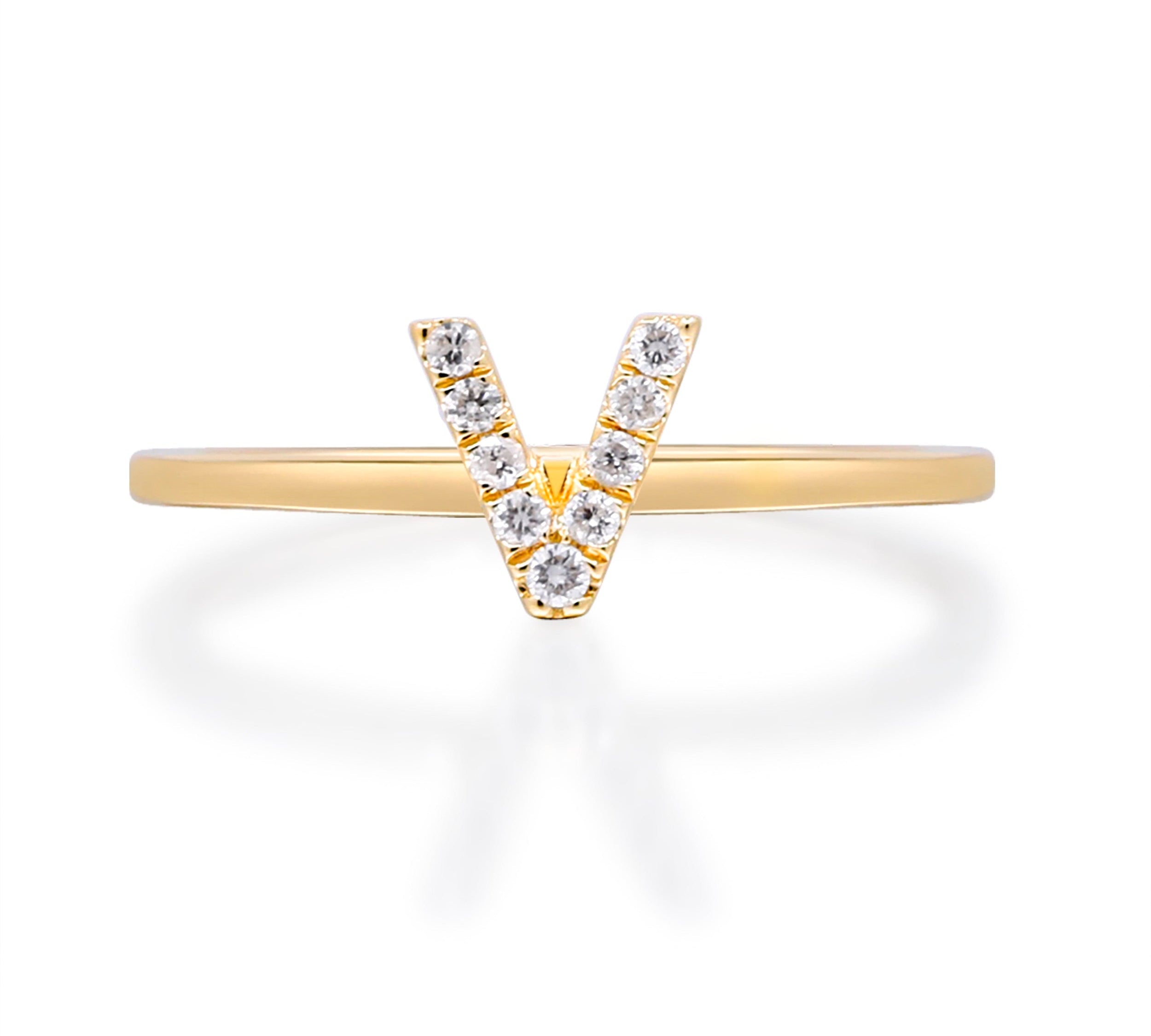 V Initial 14K Yellow Gold Round-Cut White Diamond Ring