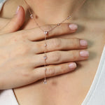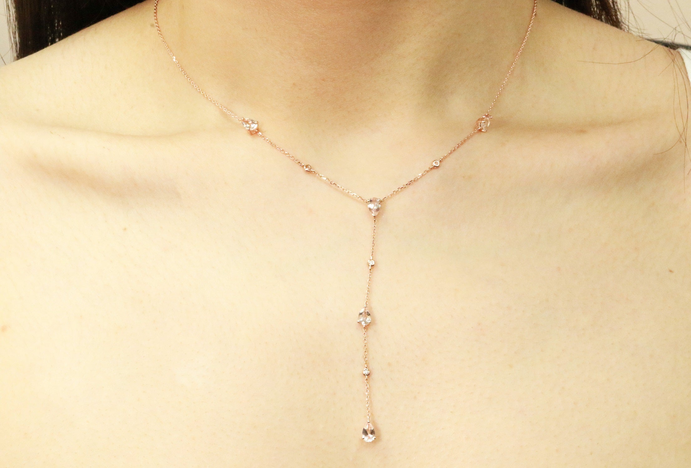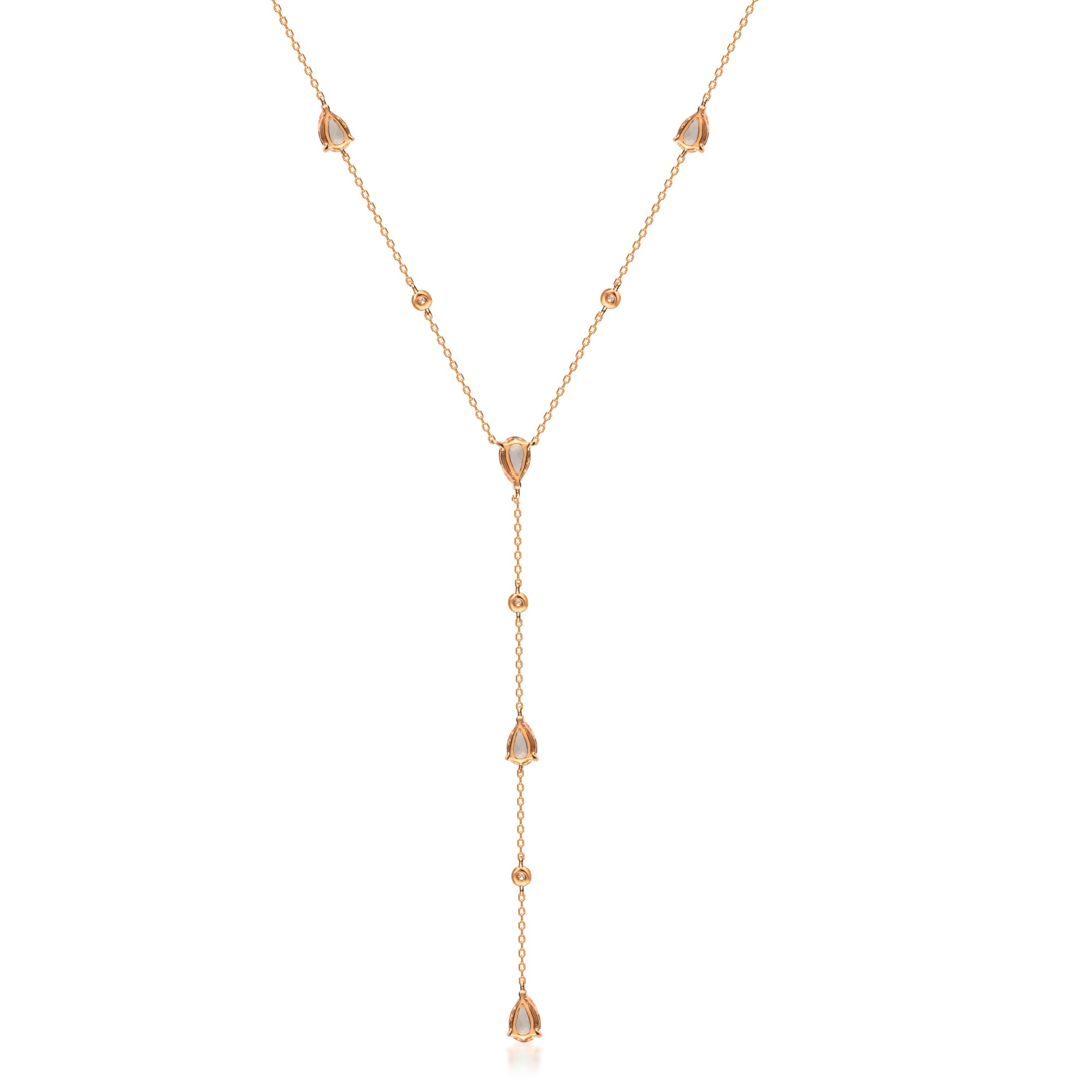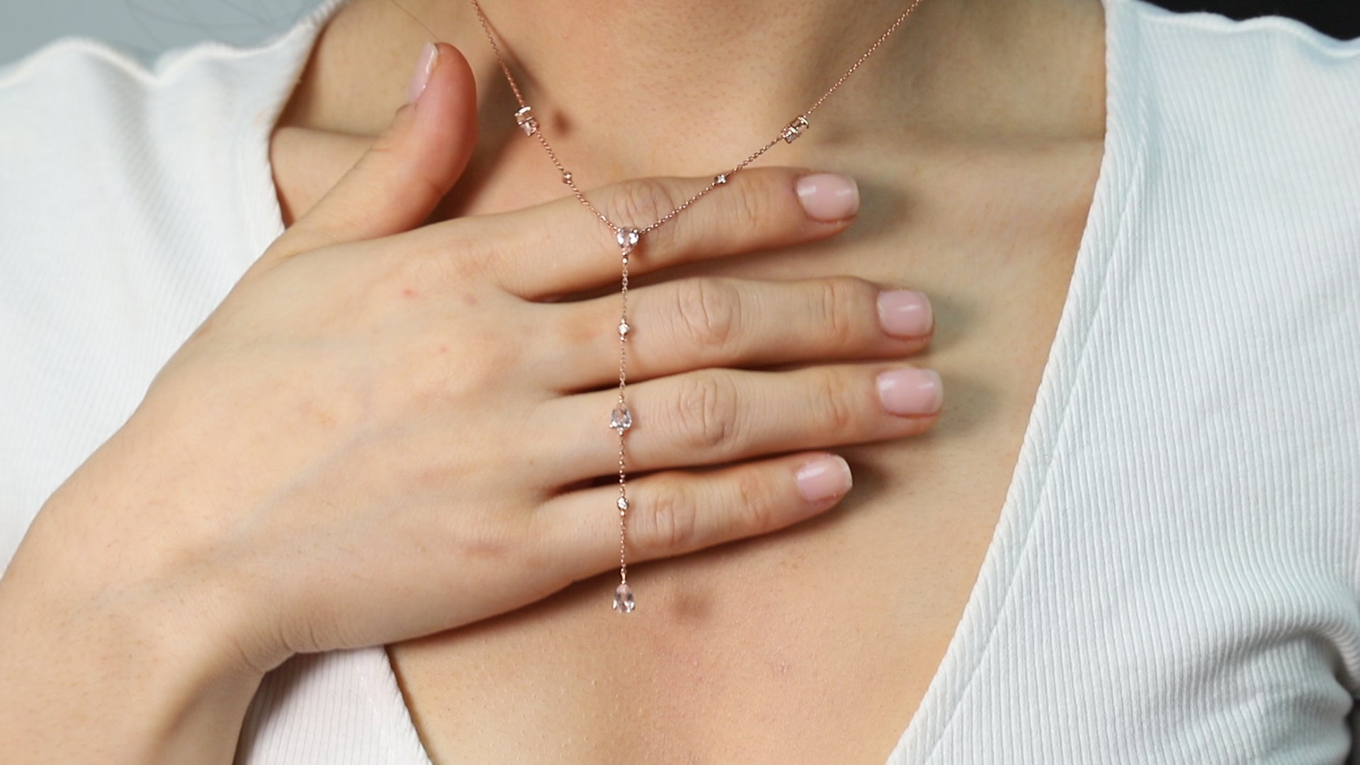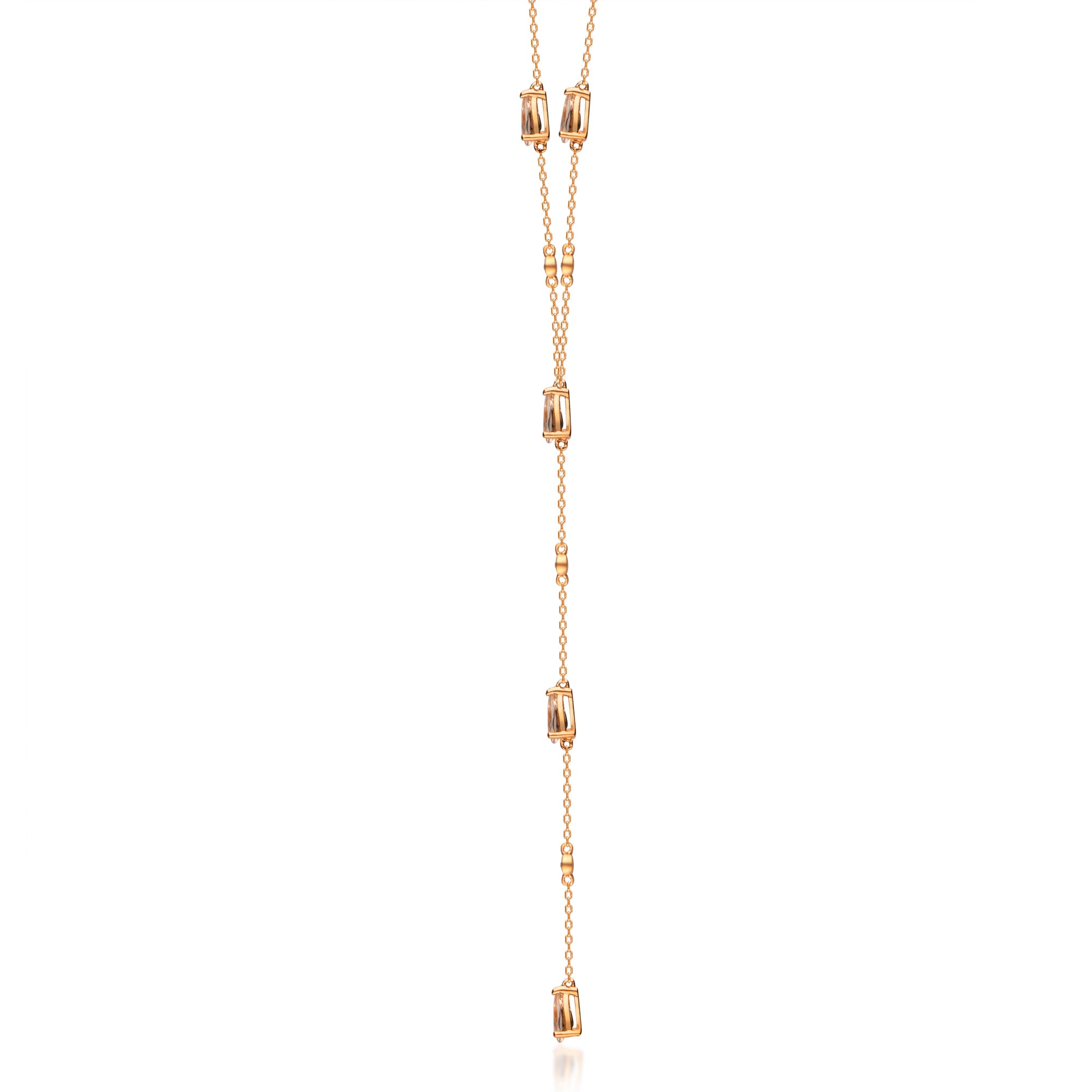 Decorate yourself in elegance with this Necklace is crafted from 14-karat rose Gold by Gin & Grace. This Necklace is made up of 4*6 mm Madagascar Morganite pear-cut (5 pcs) 1.55 and Round-cut White Diamond (4 Pcs) 0.03 carat. This Necklace is weight 2.58 grams polished to a high finish shine.