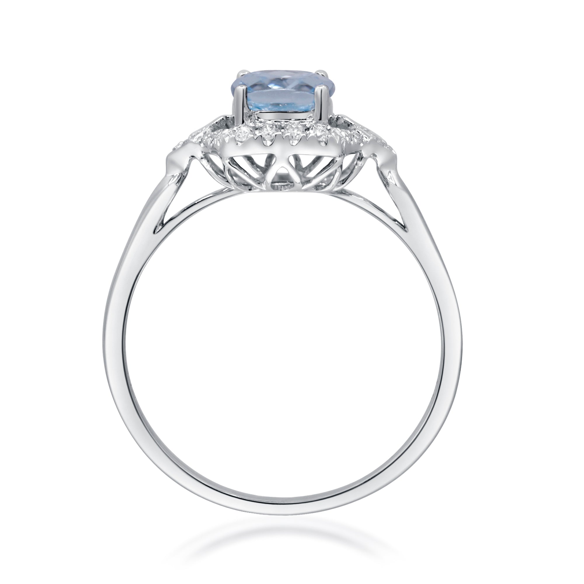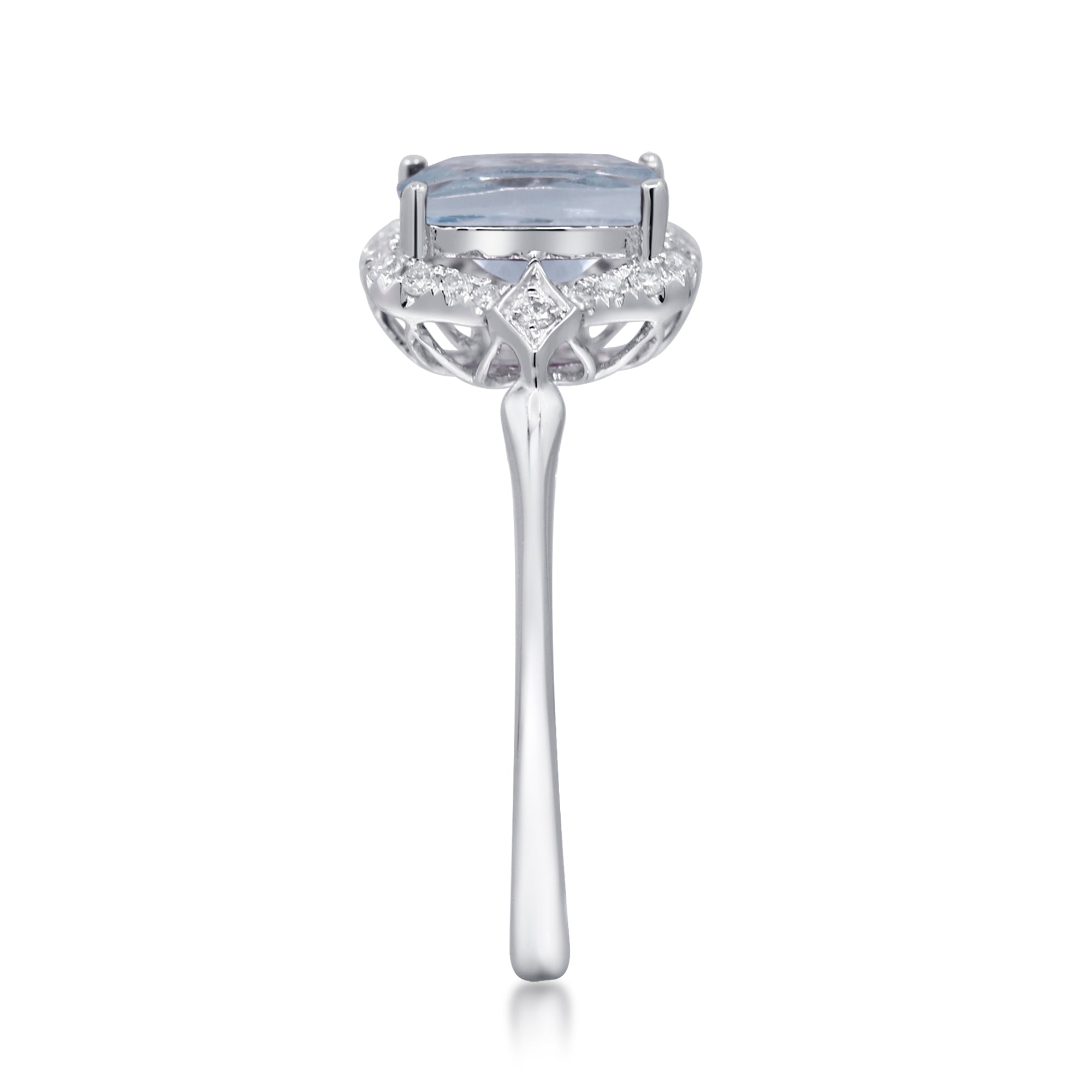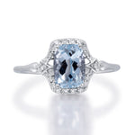 Decorate yourself in elegance with this Ring is crafted from 14-karat white Gold by Gin & Grace. This Ring is made up of Cushion-Cut Aquamarine (1 pcs) 1.25 carat and Round-cut White Diamond (22 Pcs) 0.13 Carat. This Ring is weight 1.78 grams. This delicate Ring is polished to a high finish shine.