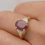 Decorate yourself in luxury with this Gin & Grace ring. The 14k Yellow Gold jewelry boasts 8X10 Oval-Cut Prong Setting Mozambique Ruby stone (1pcs) 3.55 Carat, and Round-Cut Prong Setting (16pcs) 0.11 Carat white diamond accent stones for a glimmering design. This ring is weight 3.27 grams. Natural Diamonds with good quality I1-I2. One of a kind. Crafted with 14K Yellow Gold, this delicate Ring is polished to a high finish shine.