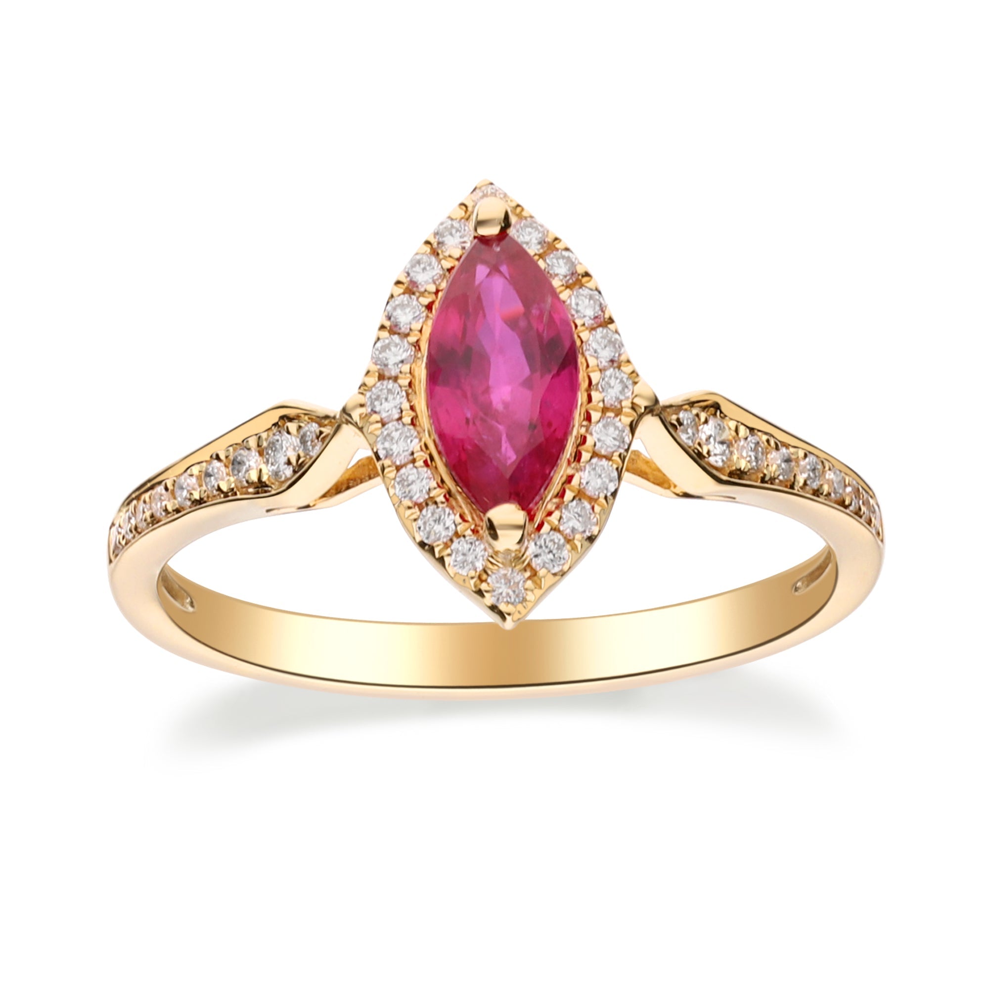 Stunning, timeless and classy eternity Unique Ring. Decorate yourself in luxury with this Gin & Grace Ring. The 10K Yellow Gold jewelry boasts Marquise-Cut Prong Setting Natural Mozambique Ruby (1 pc) 0.65 Carat, along with Natural Round cut white Diamond (38 Pcs) 0.17 Carat, accent stones for a lovely design. This Ring is weight 1.84 grams. Crafted with 10K Yellow Gold, this delicate Ring is polished to a high finish shine.