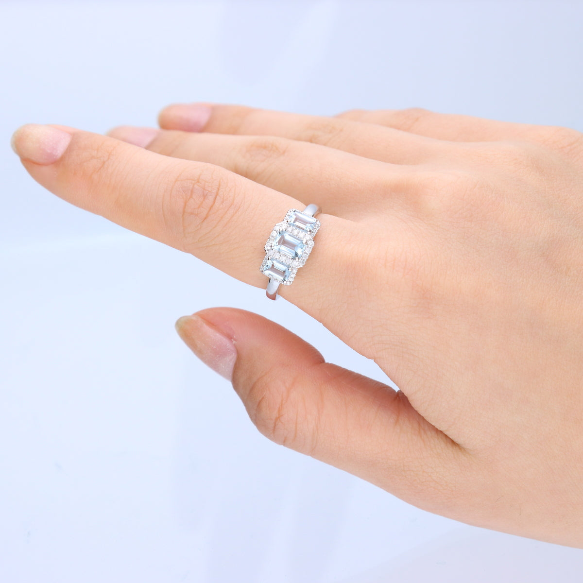 Decorate yourself in elegance with this Ring is crafted from 14-karat white Gold by Gin & Grace. This Ring is made up of 3*5 mm Brazilian Aquamarine Emerald cut (2 pcs) 0.58 carat, 4*6 mm aquamarine Emerald cut (1 pcs) 0.54Â carat Round-cut Diamond (44 pcs) 0.19 Carat. This Ring is weight 2.39 grams. This delicate Ring is polished to a high finish shine.