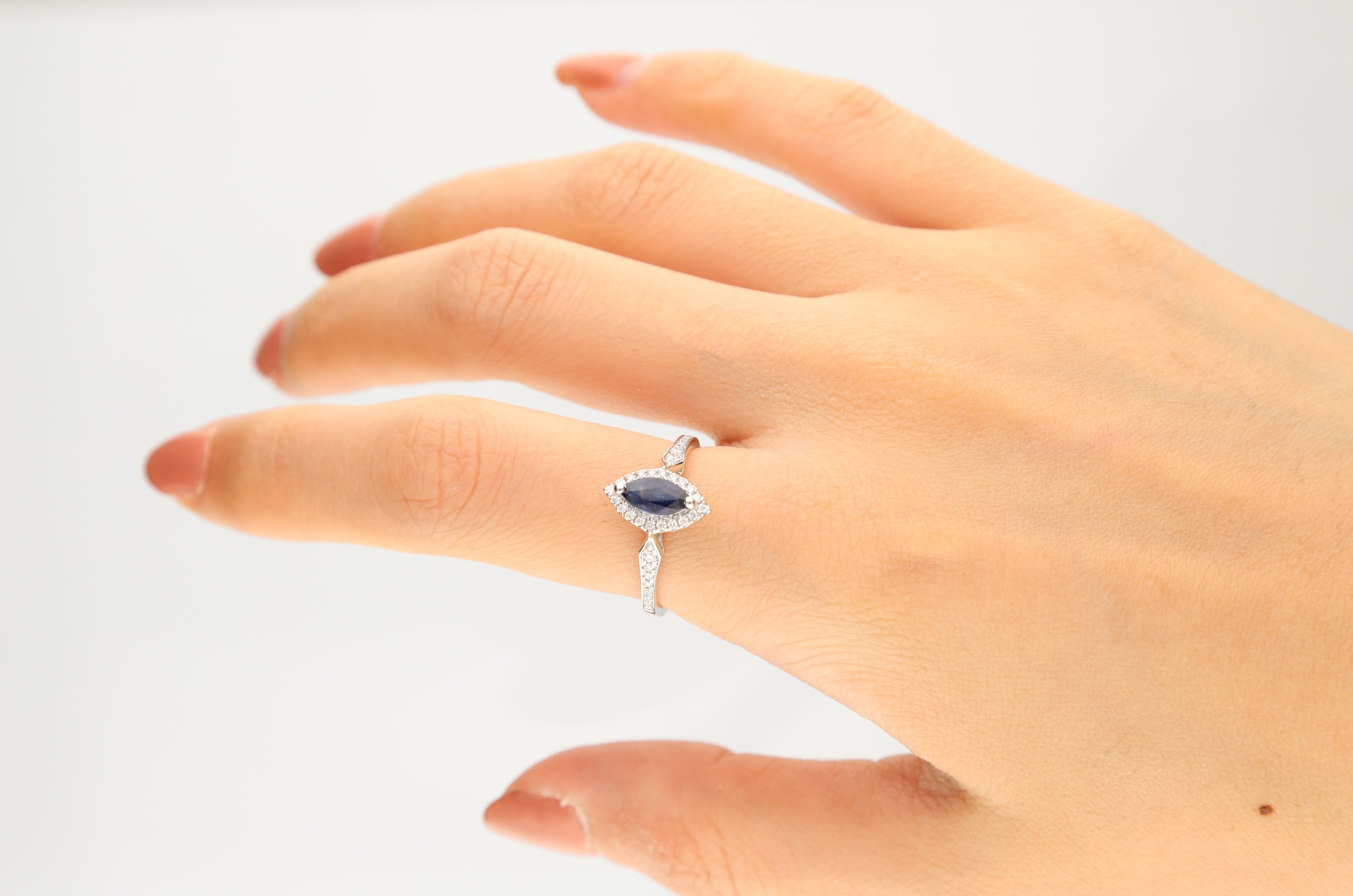 Decorate yourself in elegance with this Ring is crafted from 10K White Gold by Gin & Grace. This Ring is made up of Marquise-Cut blue sapphire (1 Pcs) 0.69 carat and round-cut white diamond (1 pcs) 0.09 carat. This Ring is weight 1.46 grams. This delicate Ring is polished to a high finish shine.