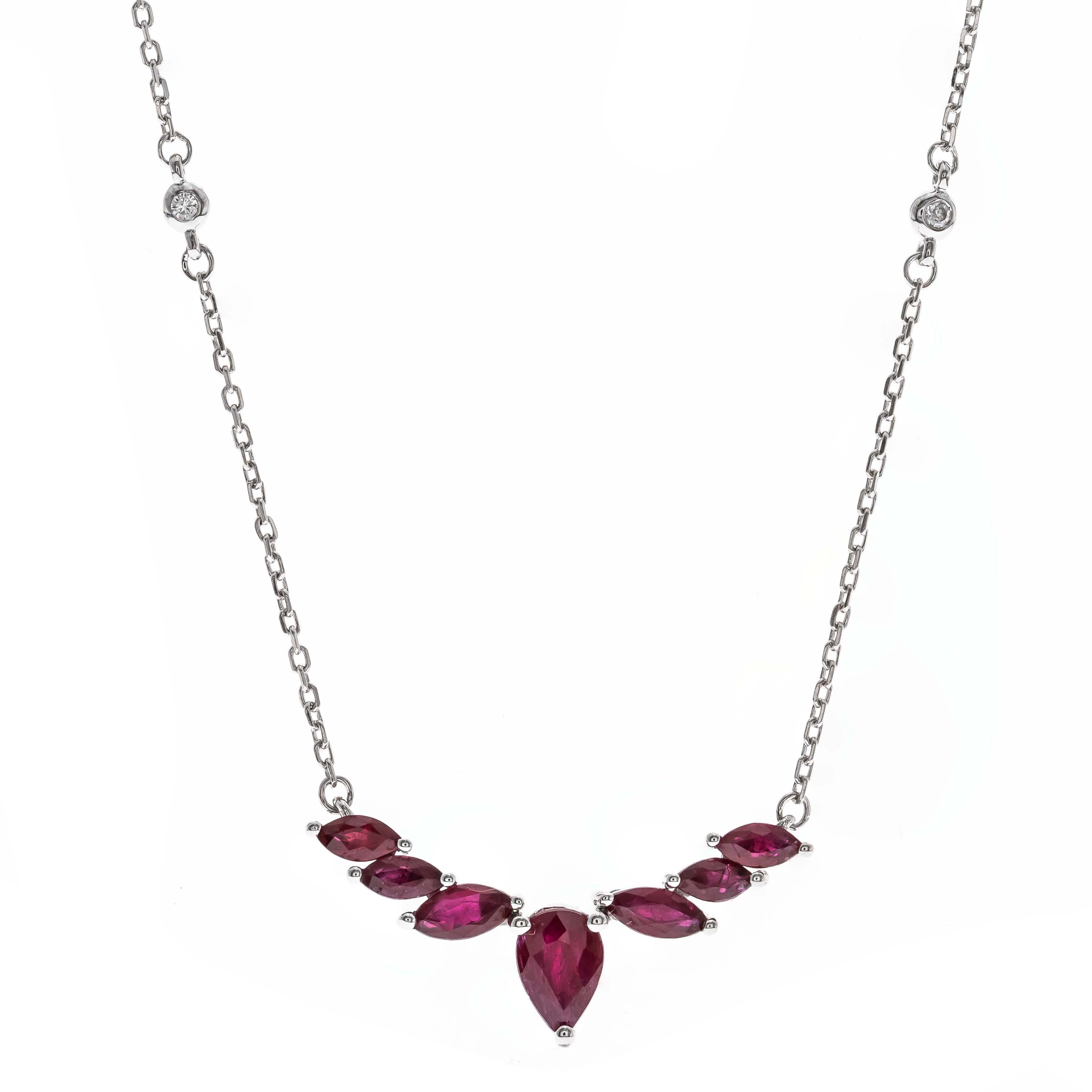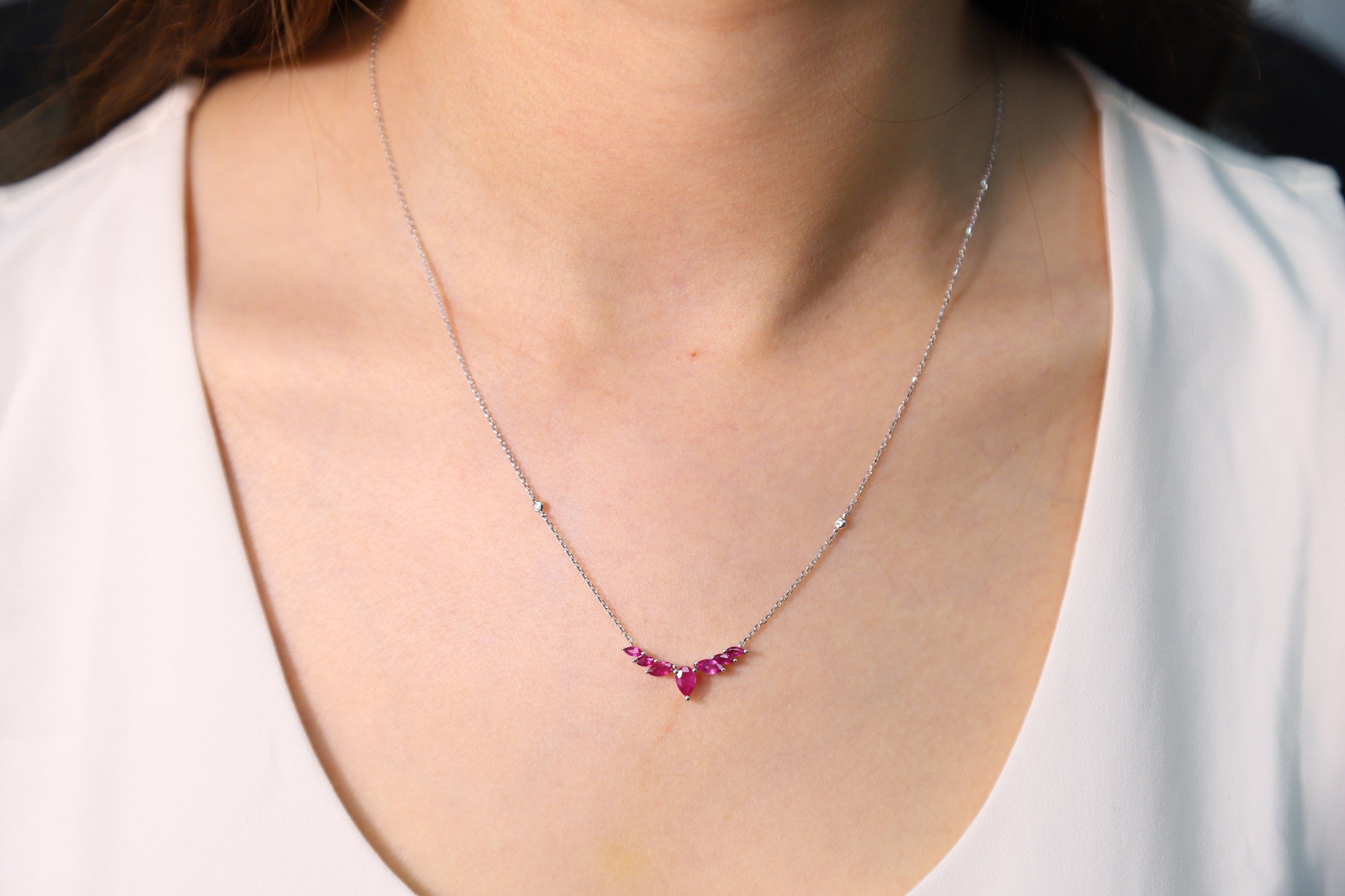 Stunning, timeless and classy eternity Unique Necklace. Decorate yourself in luxury with this Gin & Grace Necklace. The 10K White Gold jewelry boasts Pear-Cut Prong Setting Mozambique Ruby (7 pcs) 1.20 Carat, along with Natural Round cut white Diamond (2 Pcs) 0.02 Carat, accent stones for a lovely design. This Necklace is weight 2.18 grams. Crafted with 10K White Gold, this delicate Necklace is polished to a high finish shine.