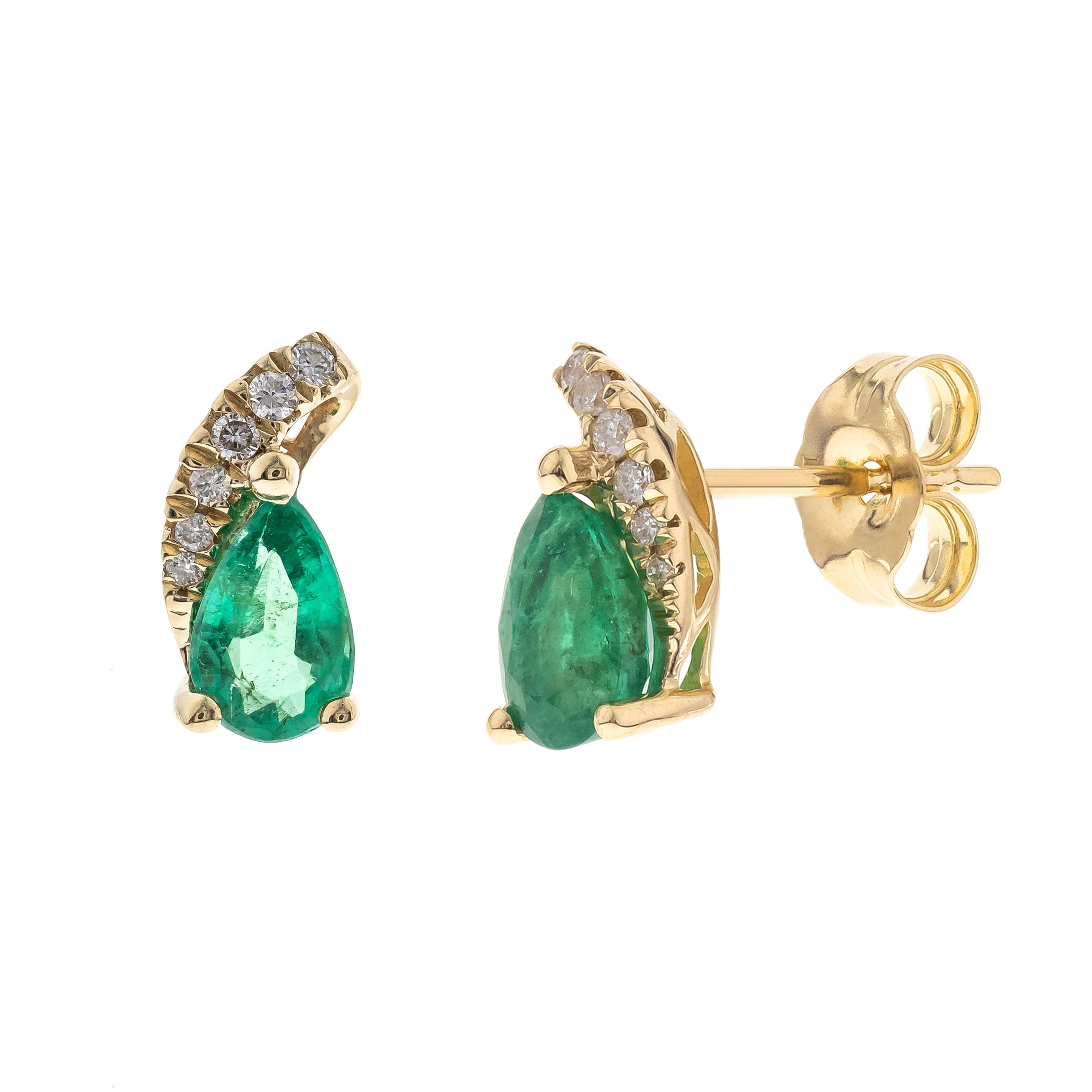 Decorate yourself in elegance with this Earring is crafted from 10K Yellow Gold by Gin & Grace. This Earring is made up of Emerald Pear-Cut (2 pcs) 0.69 carat, Round-cut White Diamond (12 Pcs) 0.06 Carat. This Earring is weight 0.93 grams. This delicate Earring is polished to a high finish shine.