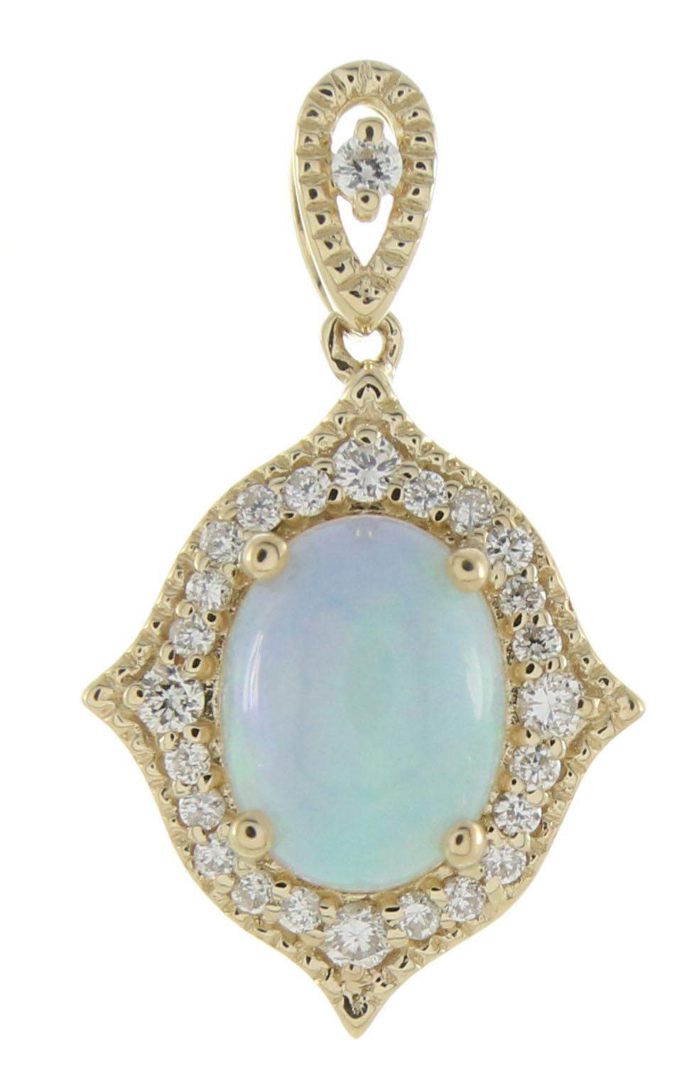 Decorate yourself in elegance with this Pendant is crafted from 14K Yellow Gold by Gin & Grace Pendant. This Pendant is made up of Oval-cut Prong setting Ethiopian opal (1 Pcs) 0.85 Carat and Round-Cut Prong setting White Diamond (25 Pcs) 0.15 Carat. This Pendant is weight 1.91 grams. The gorgeous Pendant hangs from an 18-inch wheat chain. This delicate Pendant is polished to a high finish shine.