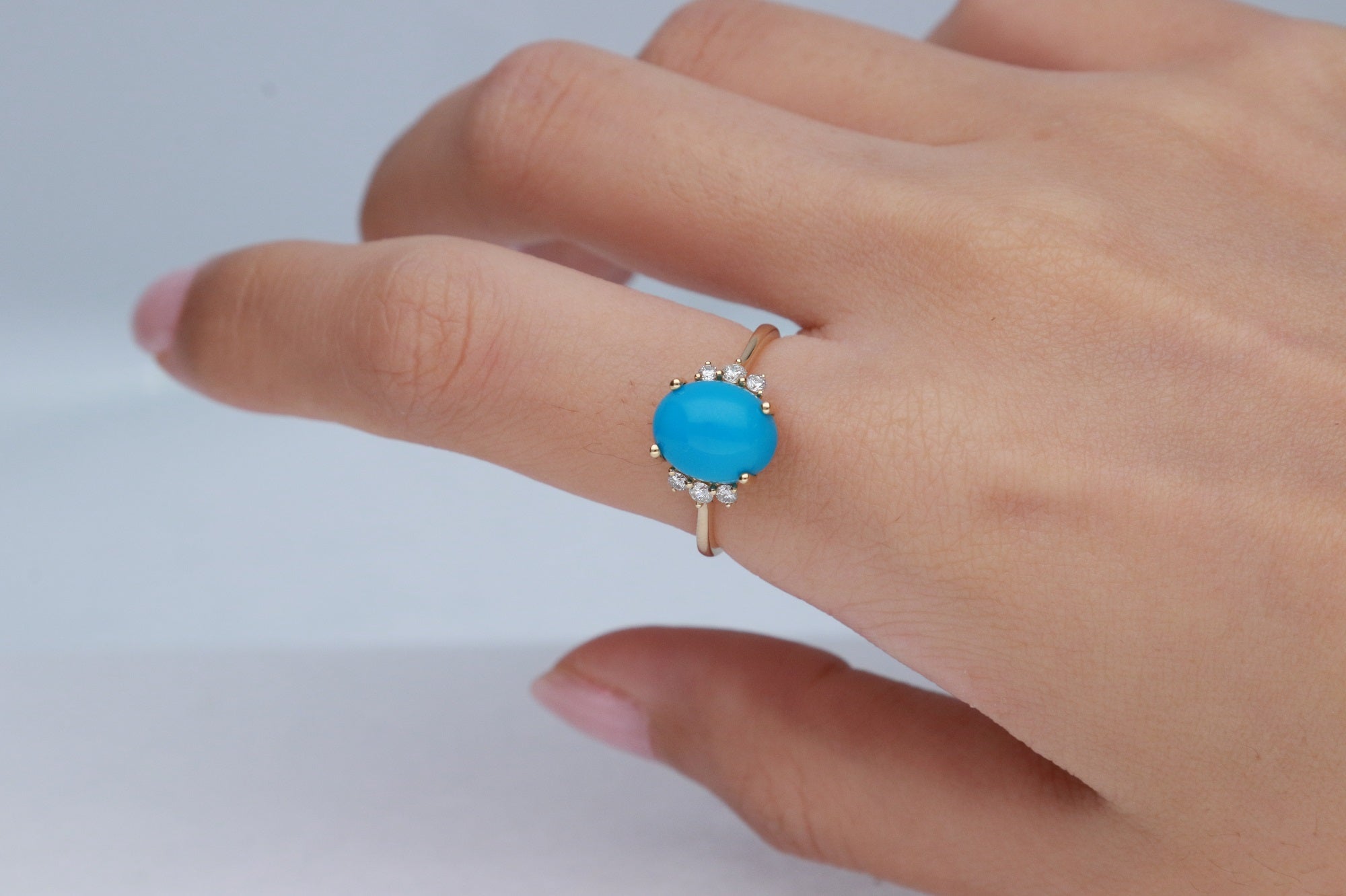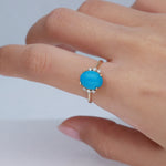Decorate yourself in elegance with this Ring crafted from 14-karat yellow Gold by Gin & Grace. This Ring is made up of 8*10MM Arizona Turquoise Oval-Cut (1 pcs) 2.97 and Round-cut diamonds (6 pcs) 0.15 Carat. This Ring weighs 1.98 grams. This delicate Ring is polished to a high finish shine.