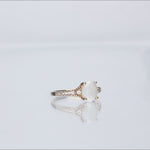 A lustrous oval-cut African Opal gemstone is set in a marquise-shaped setting of 10K yellow gold. Surrounded by brilliant diamond accent stones, this Gin & Grace ring is finished with a high polish. Gemstone colors: White Gemstone shapes: Oval One prong-set oval-cut Australian opal measures Gemstone weight: 1.08 carat Total gemstone weight: 1.08 carat Diamonds: 16 Diamond cut: Round Diamond measurements: Each measure 1 mm Diamond weight: 0.16 carat Color: G-H Clarity: I1-I2 Setting: Prong Metal: 10k yellow gold Finish: High polish Metal weight: 2.29 grams Ring setting dimensions: 19 mm wide x 25 mm long Band dimensions: 2 mm wide.