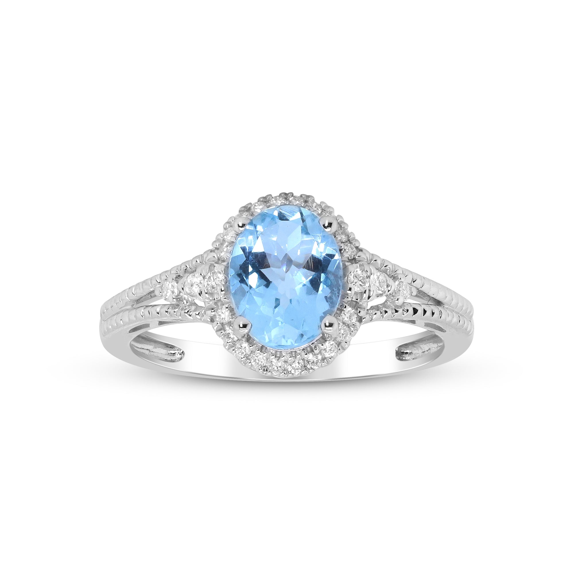 Decorate yourself in elegance with this Ring crafted from 14-karat white Gold by Gin & Grace. This Ring is made up of 6*8 Brazilian Aquamarine Oval-Cut (1 pcs) 1.08 and Round-cut Diamond (26 pcs) 0.11 Carat. This Ring weighs 2.3 grams. This delicate Ring is polished to a high finish shine.