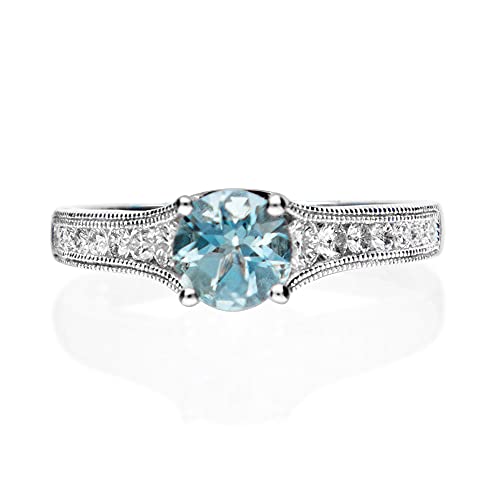 Stunning, timeless and classy eternity Engagement ring. Decorate yourself in luxury with this Gin & Grace ring. This ring is made up of Round-Cut Prong Setting Genuine Brazilian Aquamarine (1 pcs) 0.78 Carat and Round-Cut Prong Setting Diamond (14 pcs) 0.41 Carat accent stones for a lovely design. This ring is weight 2.94 grams. The ring is crafted of shining 14-karat White Gold and is completed by a highly polished finish.