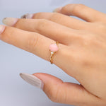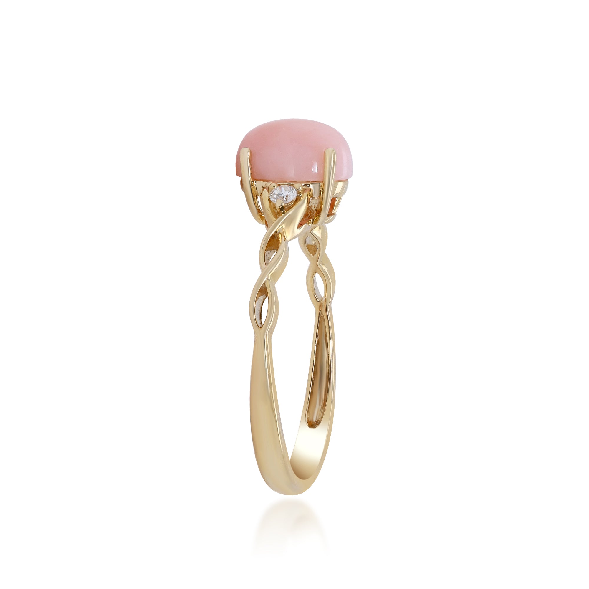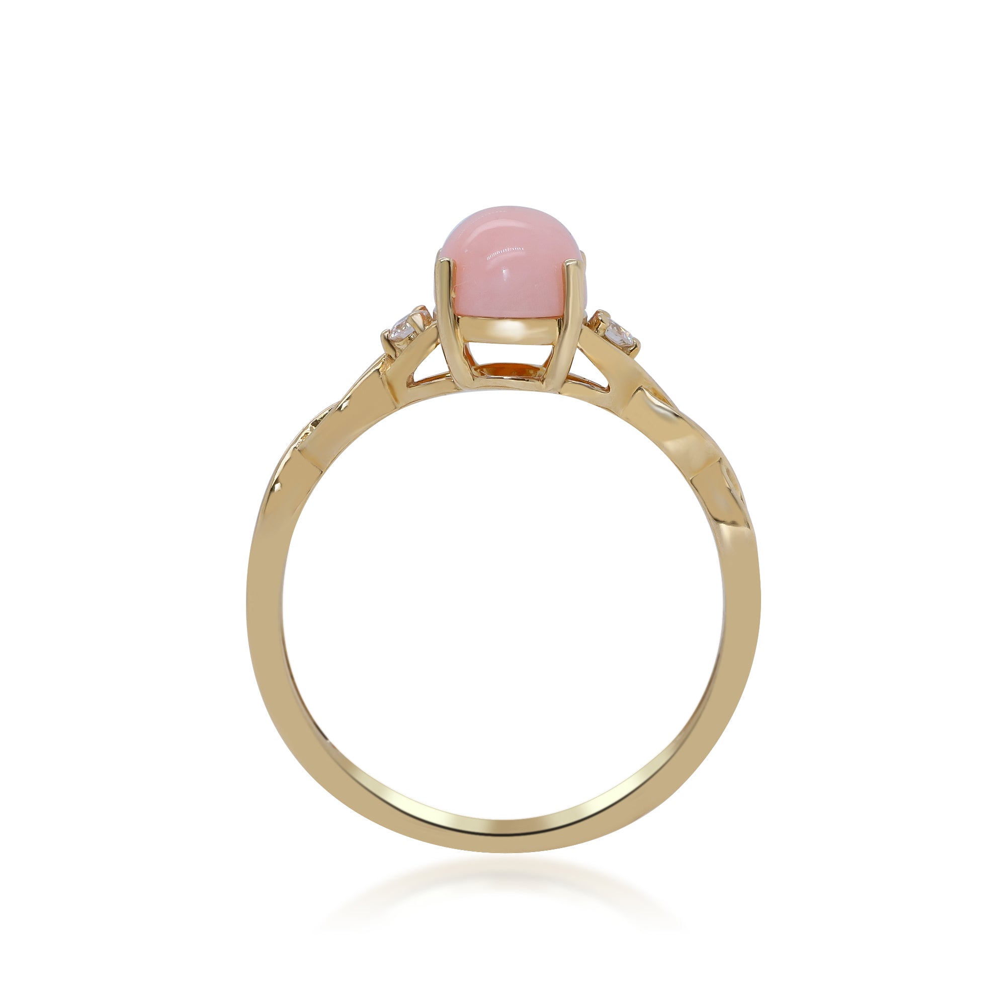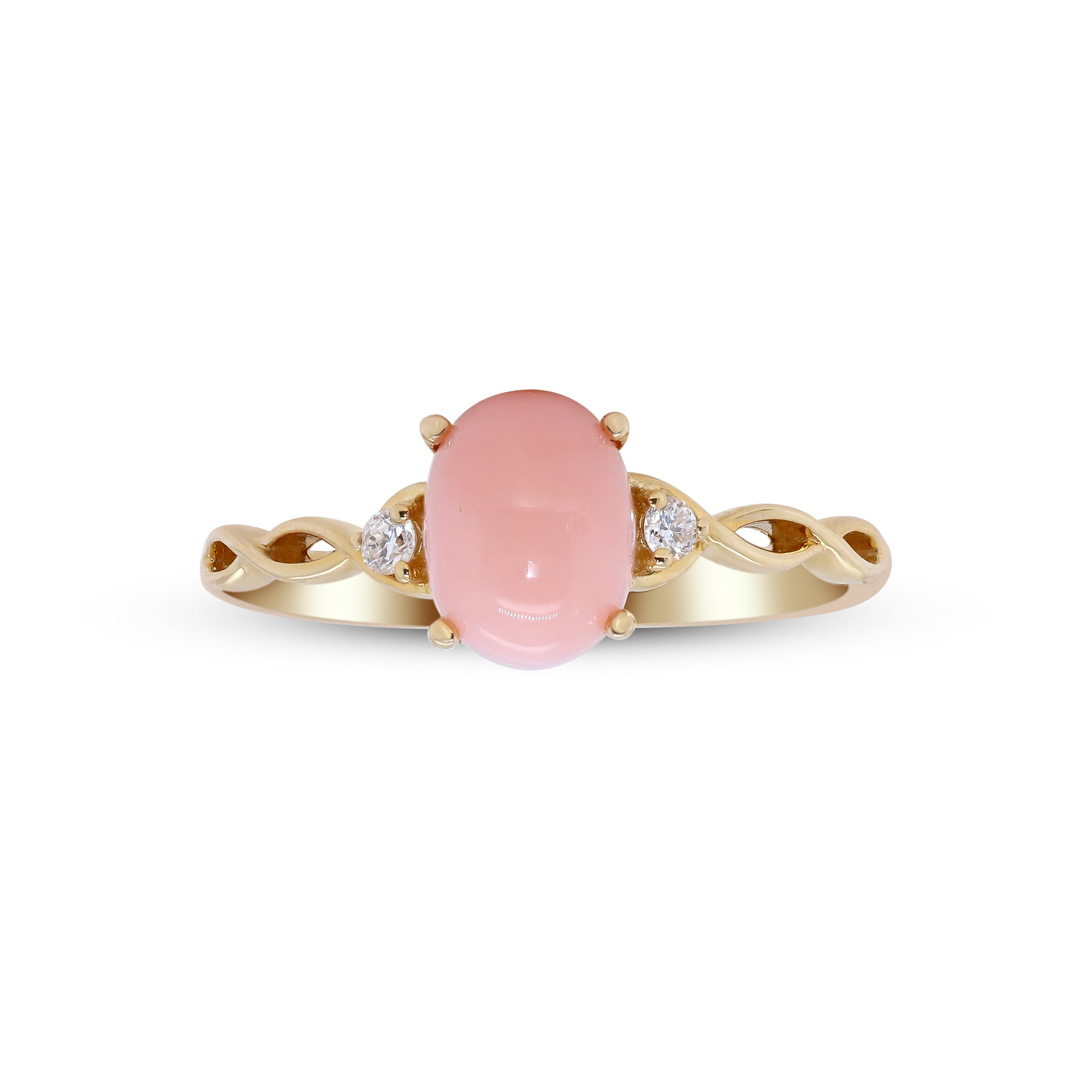 Decorate yourself in elegance with this Ring is crafted from 14-karat Yellow Gold by Gin & Grace. This Ring is made up of Oval-Cut Pink Opal (1 pcs) 1.21carat and Round-cut Diamond (2 pcs) 0.05 carat. This Ring is weight 1.76 grams. This delicate Ring is polished to a high finish shine.