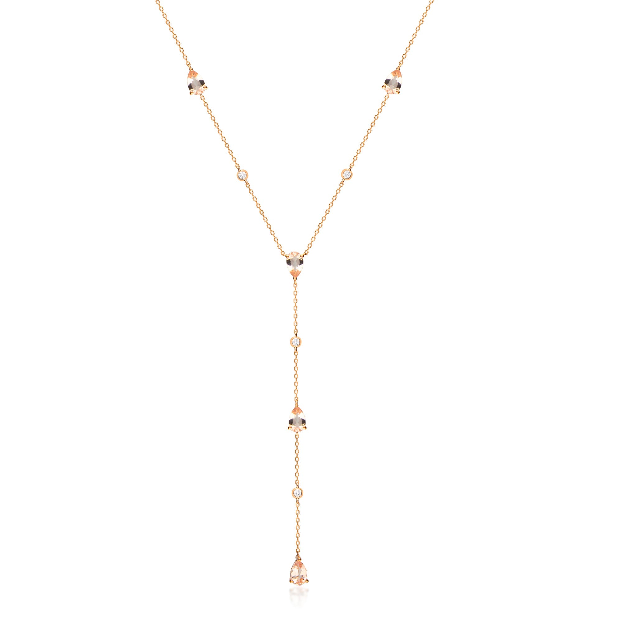 Decorate yourself in elegance with this Necklace is crafted from 14-karat rose Gold by Gin & Grace. This Necklace is made up of 4*6 mm Madagascar Morganite pear-cut (5 pcs) 1.55 and Round-cut White Diamond (4 Pcs) 0.03 carat. This Necklace is weight 2.58 grams polished to a high finish shine.
