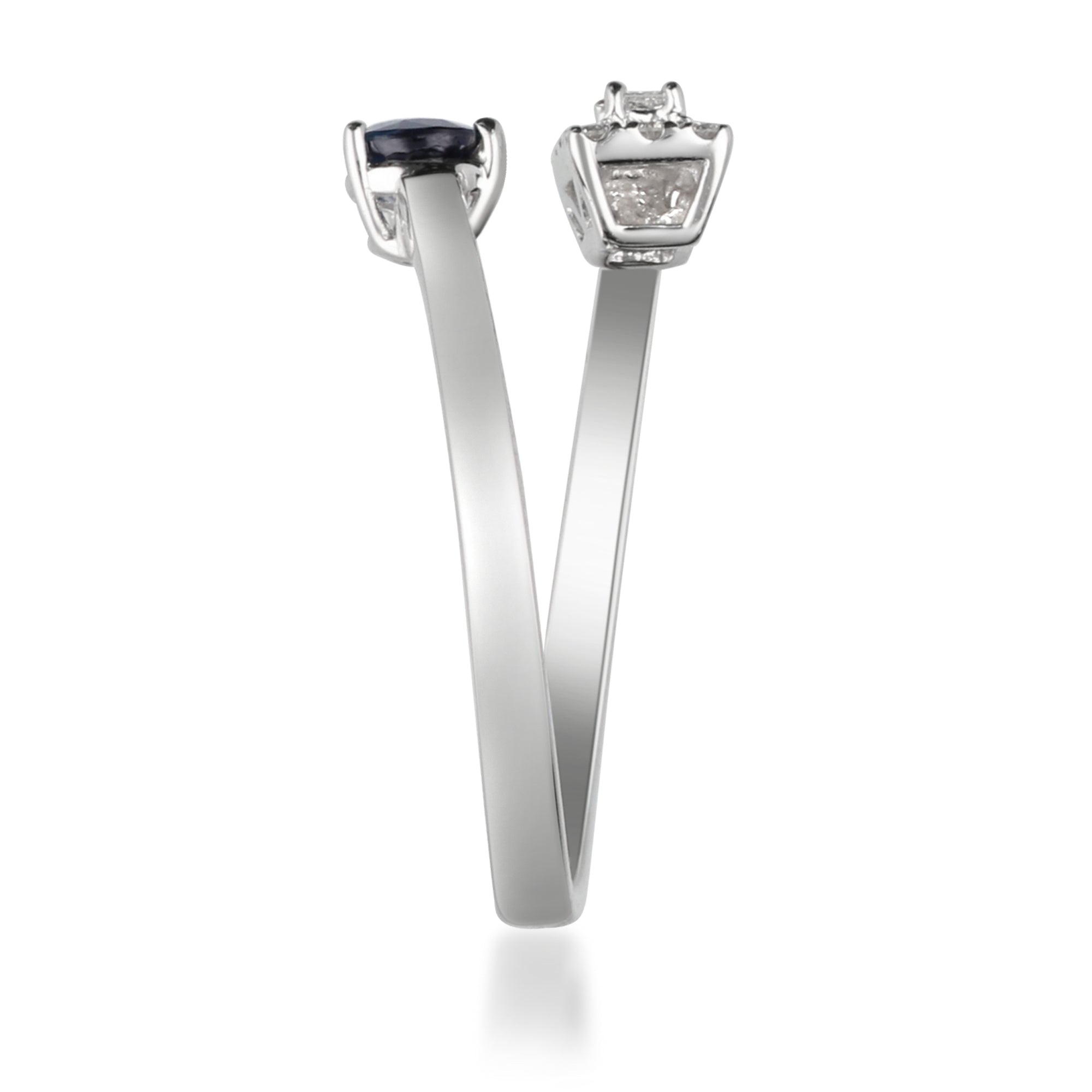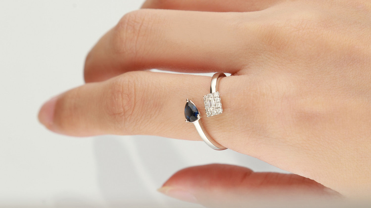 Stunning, timeless and classy eternity Unique Ring. Decorate yourself in luxury with this Gin & Grace Ring. This Ring is made up of Pear-Cut Prong Setting Genuine Blue Sapphire (1 pc) 0.48 Carat, Natural Baguette Diamond (1 Pc ) 0.04 Carat and Round-Cut Prong Setting Natural Diamond (10 pcs) 0.07 Carat accent stones for a lovely design. This Ring is weight 2.42 grams. The Ring is crafted of shining 14K White Gold and is completed by a highly polished finish.