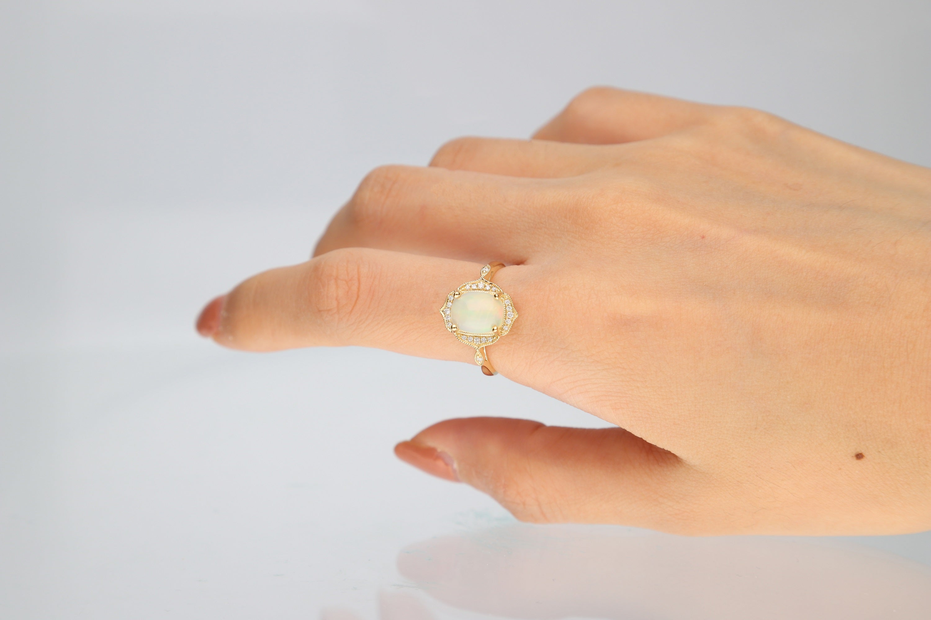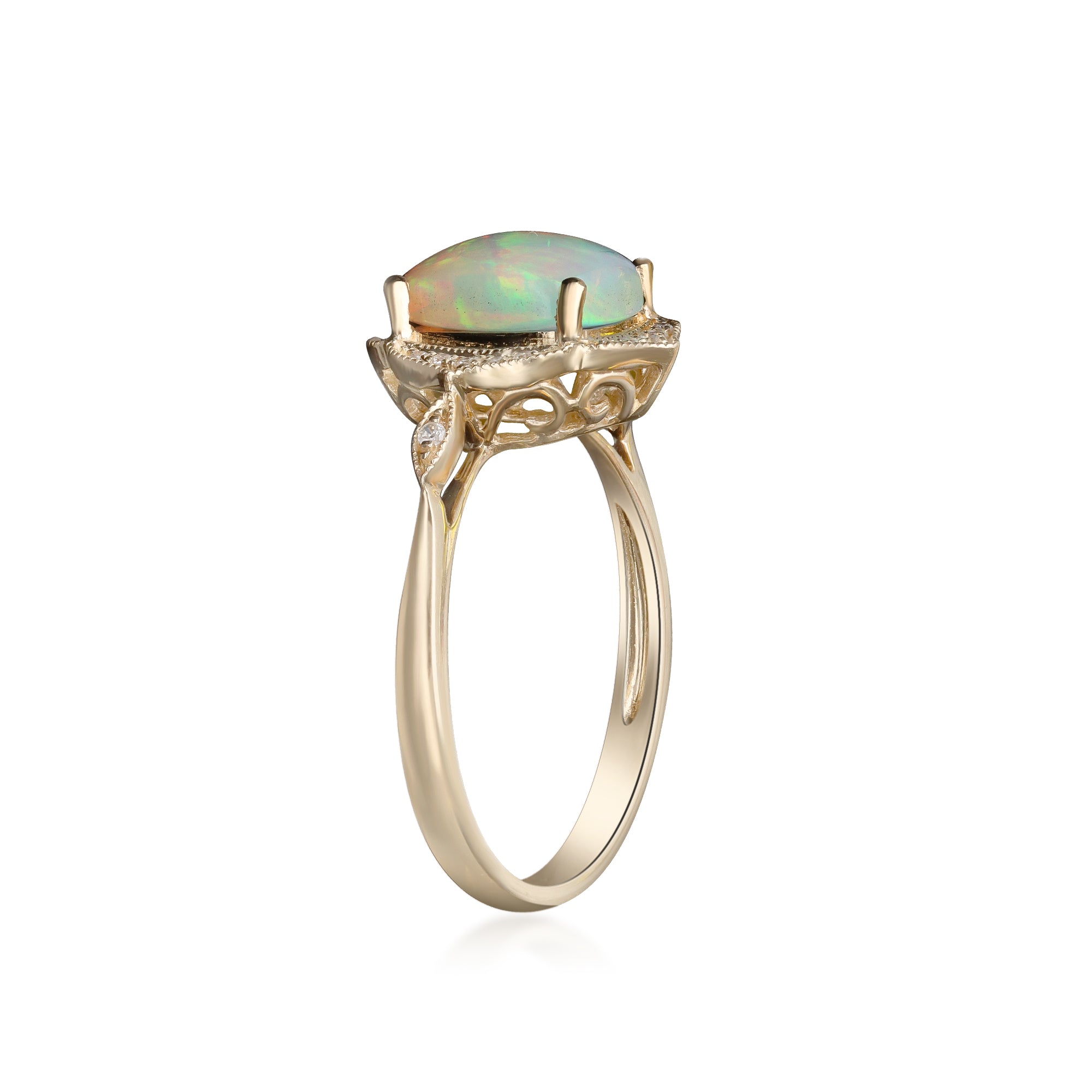Stunning, timeless and classy eternity Unique ring. Decorate yourself in luxury with this Gin & Grace ring. This ring is made up of Cushion-cut Prong Setting African Opal (1 pcs) 1.43 Carat and Round-Cut Prong Setting Diamond (22 pcs) 0.09 Carat accent stones for a lovely design. This ring is weight 3.12 grams. The ring is crafted of shining 14-karat Yellow Gold and is completed by a highly polished finish.