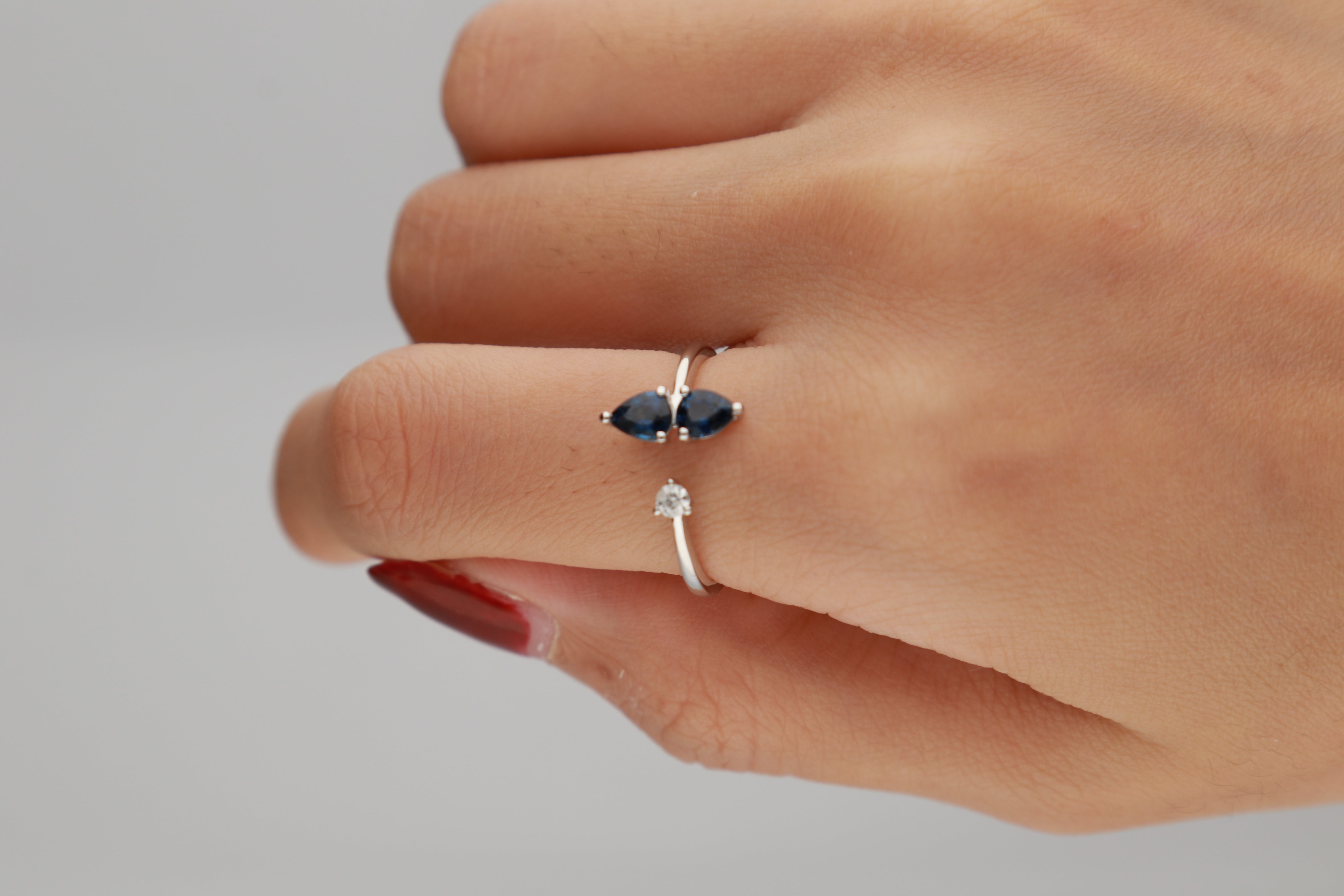 Stunning, timeless and classy eternity Unique Ring. Decorate yourself in luxury with this Gin & Grace Ring. The 14k White Gold jewelry boasts Pear-Cut Prong Setting Genuine Ceylon Blue Sapphire (2 pcs) 0.83 Carat, along with Natural Round cut white Diamond (1 Pc) 0.07 Carat, accent stones for a lovely design. This Ring is weight 2.08 grams. Crafted with 14k White Gold, this delicate Ring is polished to a high finish shine.