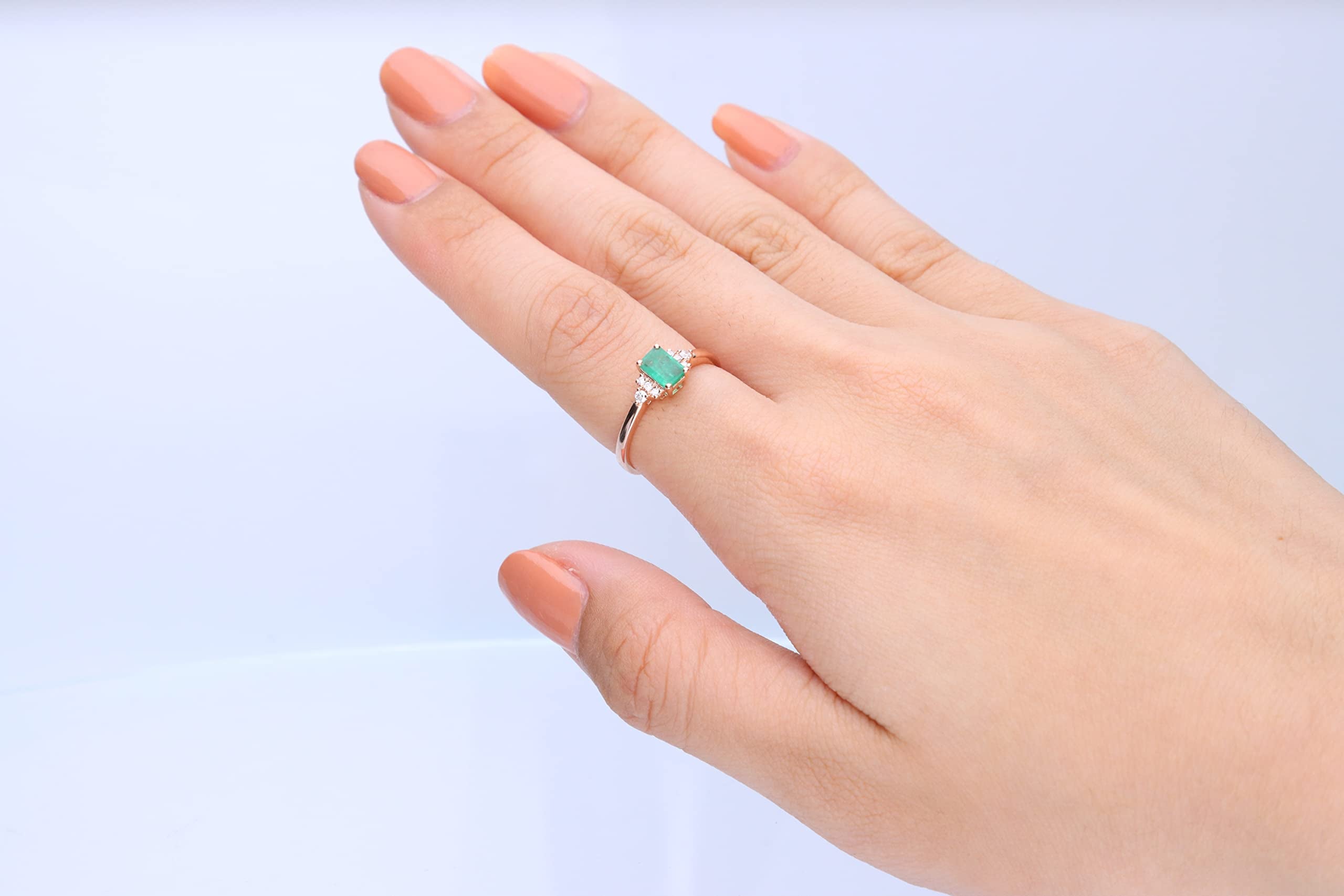 Decorate yourself in elegance with this Ring is crafted from 10-karat Rose Gold by Gin & Grace. This Ring is made up of Zambian Emerald Emerald-cut (1 pcs) 0.55 and Round-cut Diamond (8 pcs) 0.08 Carat. This Ring is weight 1.32 grams. This delicate Ring is polished to a high finish shine.