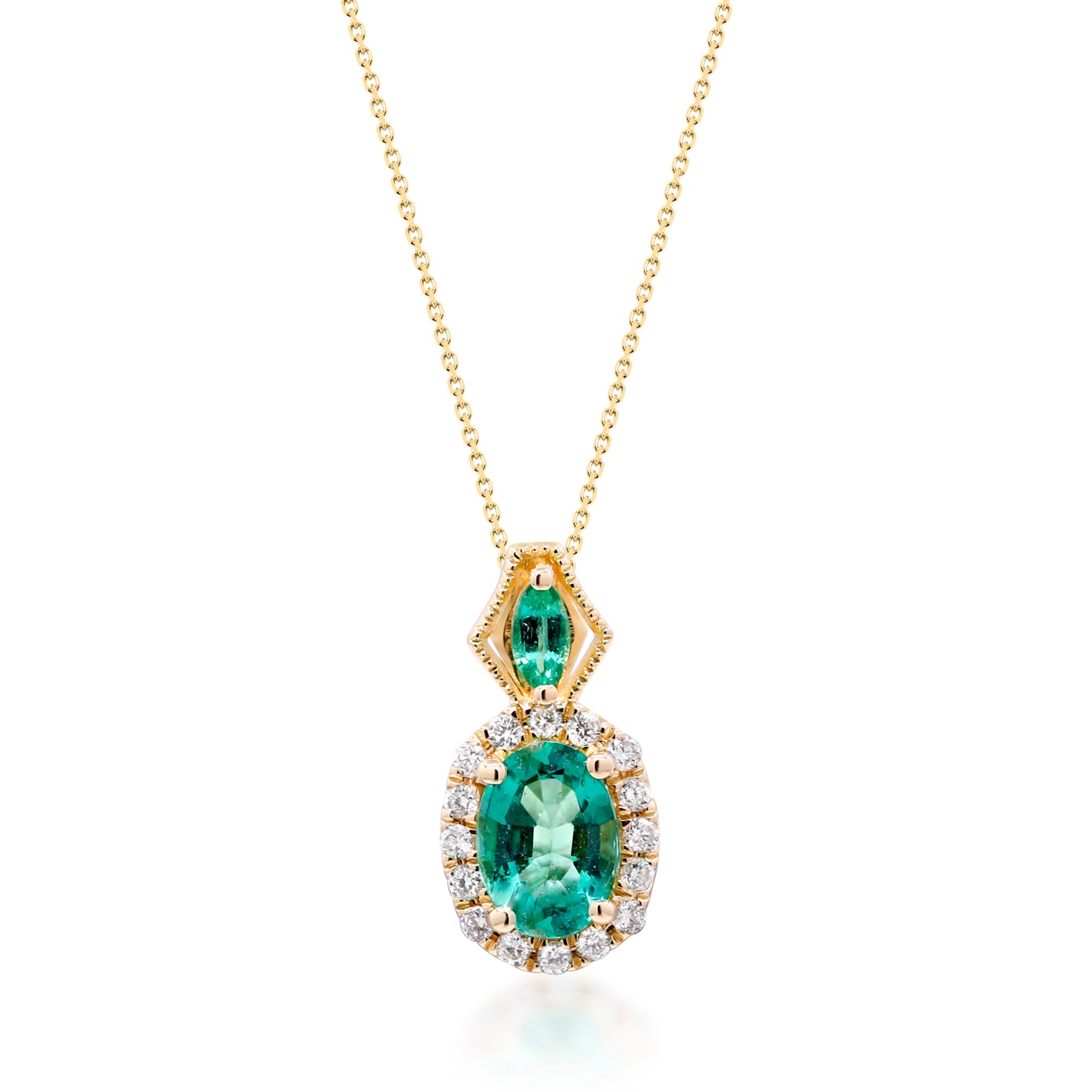 Decorate yourself in elegance with this Pendant is crafted from 14-karat Yellow Gold by Gin & Grace. This Pendant is made up of 7x5 mm Oval-Cut Zambian Emerald (1 pcs) 0.67 carat, 4x2 mm Marquise-cut Zambian Emerald (1 pcs) 0.08 carat and Round-cut White Diamond (16 Pcs) 0.12 Carat. This Pendant is weight 2.17 grams. This delicate Pendant is polished to a high finish shine.