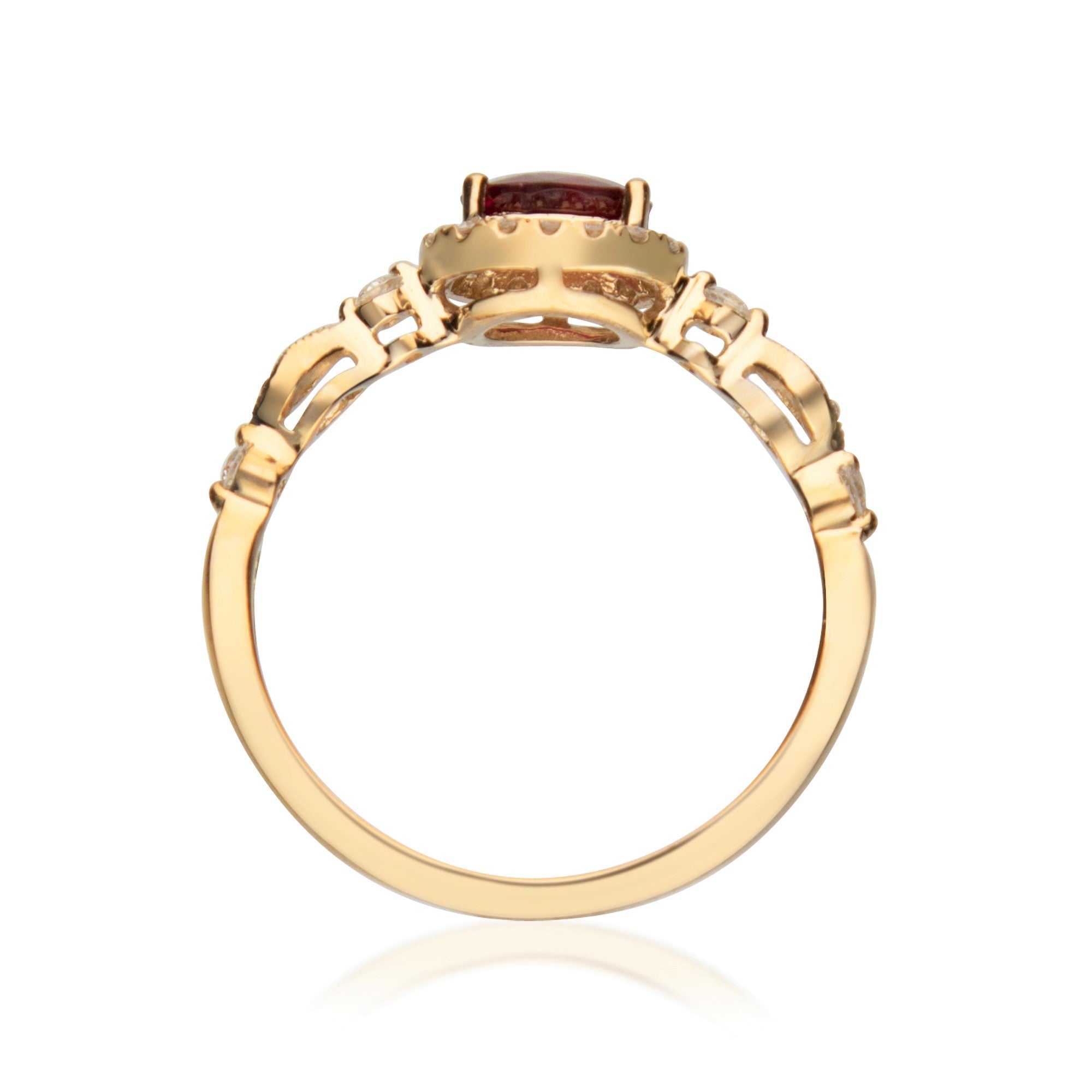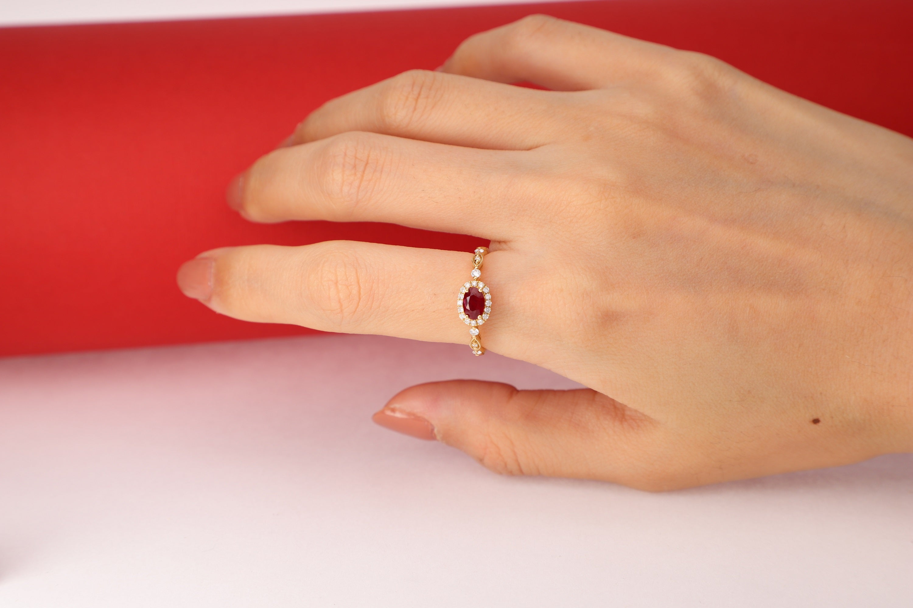 Decorate yourself in elegance with this Ring is crafted from 10-karat Yellow Gold by Gin & Grace. This Ring is made up of 4*6 oval-cut Mozambique Ruby (1 pcs) 0.59 carat Mozambique Ruby and Round Cut Diamond (22 Pcs) 0.20 Carat. This Ring is weight 1.44 grams. This delicate Ring is polished to a high finish shine.