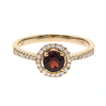 Decorate yourself in elegance with this Ring is crafted from 14-karat Yellow Gold ring by Gin & Grace. This Ring is made up of 5.0 Round-Cut Garnet (1 Pcs) 0.62 carat and Round-cut White diamond (36 pcs) 0.17 carat. This Ring is weight 2.33 grams. This delicate Ring is polished to a high finish shine.