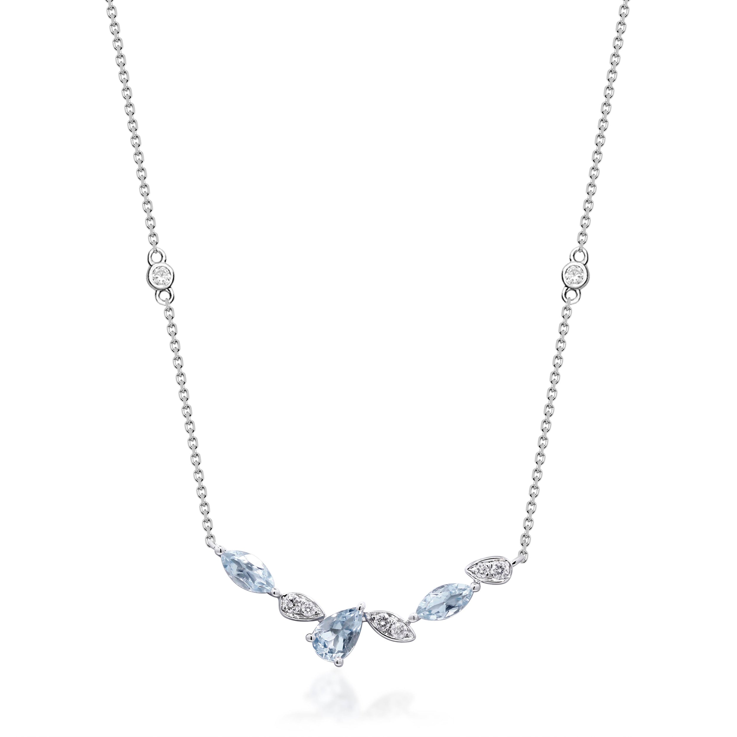 Decorate yourself in elegance with this Necklaces is crafted from 14-karat White Gold by Gin & Grace. This Necklaces is made up of Pear-Cut Aquamarine (1 pcs) 0.35 carat, 3*6 marquise-cut Aquamarine (2 pcs) 0.42 carat and round-cut White Diamond (8 Pcs) 0.16 Carat. This Necklaces is weight 2.45 grams. This delicate Necklaces is polished to a high finish shine.