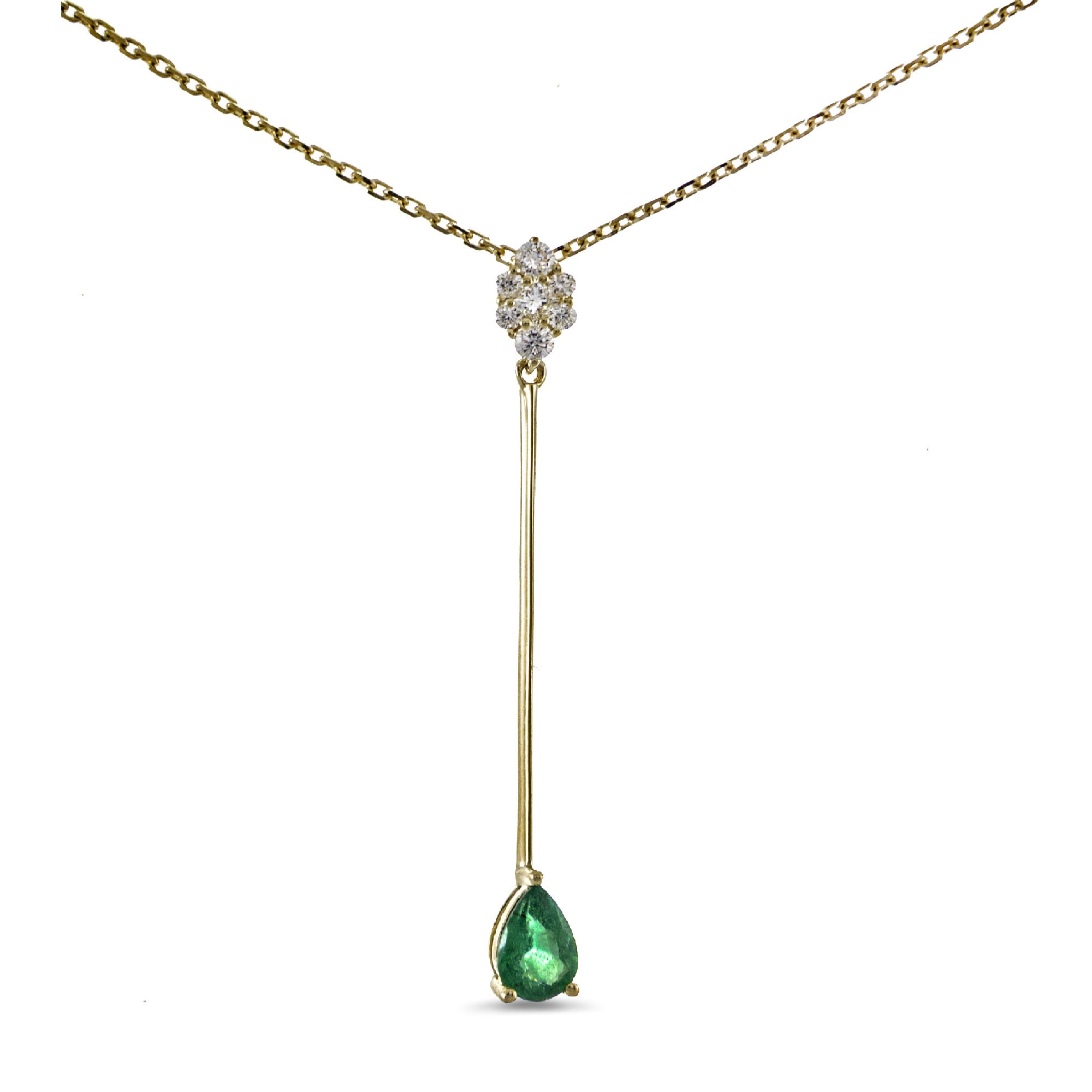 Decorate yourself in elegance with this Necklace is crafted from 14-karat Yellow Gold by Gin & Grace. This Necklace is made up of Pear-Cut emerald (1 pcs) 0.36 carat and pc diamond (1 Pcs) 0.03 carat round-cut White Diamond (6 Pcs) 0.09 Carat. This Necklace is weight 2.04 grams. This delicate Necklace is polished to a high finish shine.
