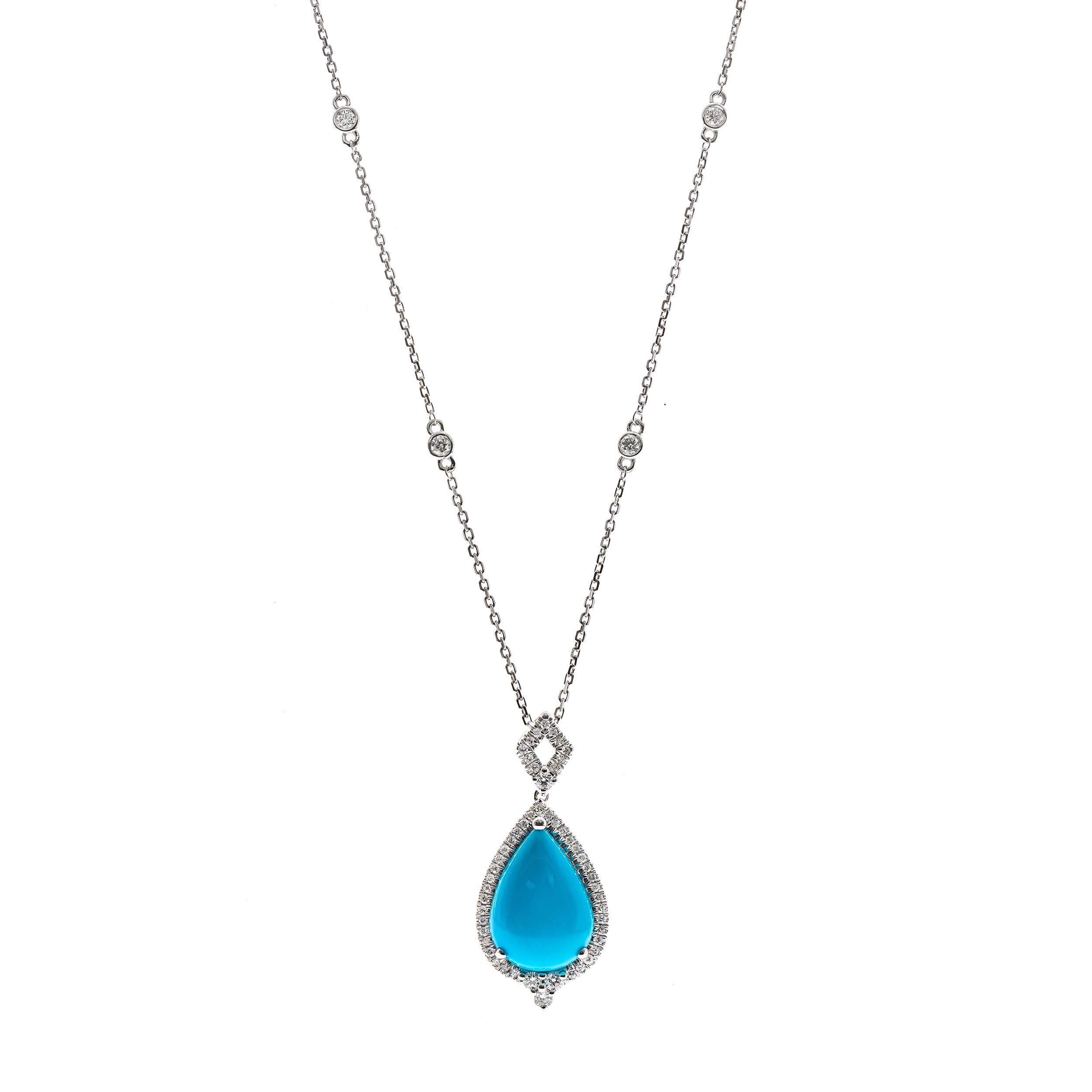 Decorate yourself in elegance with this Pendant is crafted from 14K White Gold by Gin & Grace Pendant. This Pendant is made up of Pear-Cab Cabochon setting Natural Arizona Turquoise (1 Pcs) 5.06 Carat and Round-Cut Prong setting Natural White Diamond (54 Pcs) 0.34 Carat. This Pendant is weight 4.06 grams. The gorgeous Pendant hangs from an 18-inch wheat chain. This delicate Pendant is polished to a high finish shine.