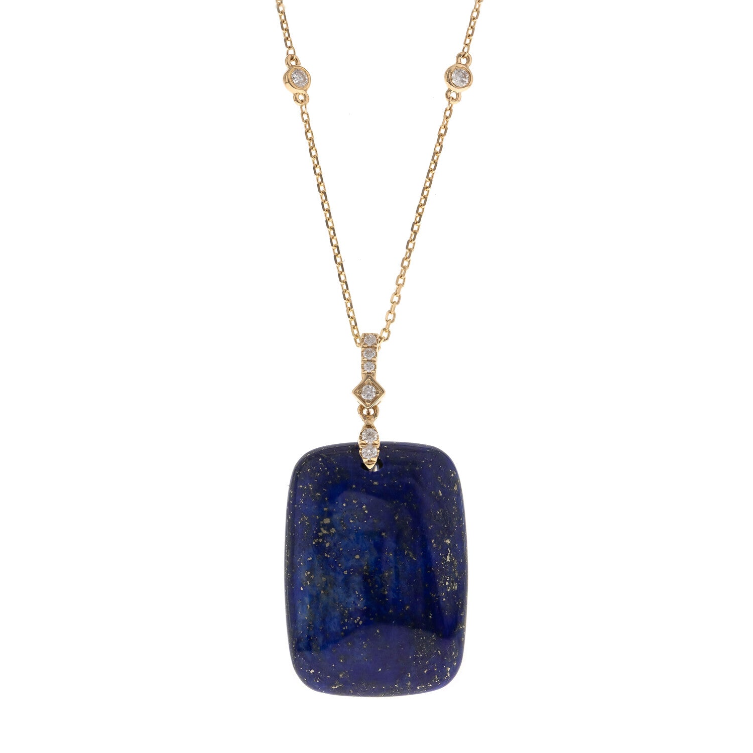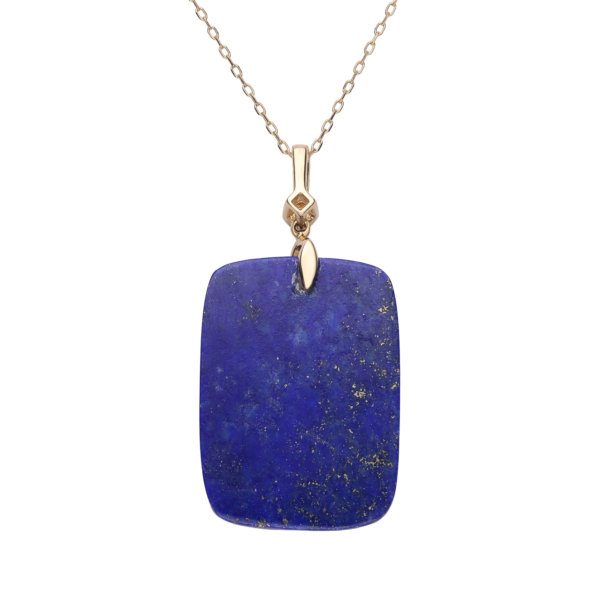 Decorate yourself in elegance with this Pendant is crafted from 14K Yellow Gold by Gin & Grace. This Pendant is made up of Cushion-Cut Lapis (1 Pcs) 30.26 carat and Round-Cut White Diamond (8 pcs) 0.08 carat. This Pendant is weight 1.58 grams. This delicate Pendant is polished to a high finish shine.