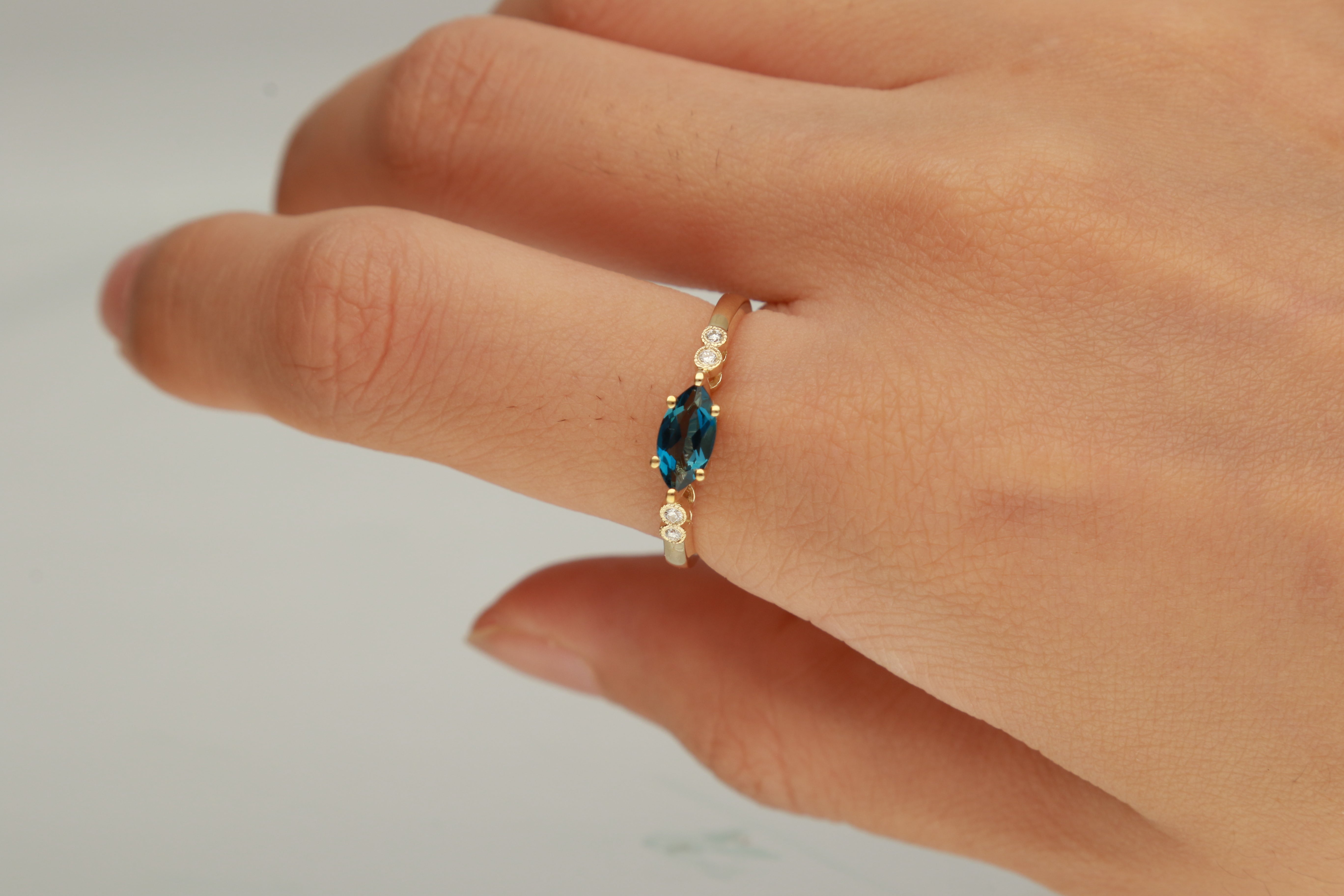 Decorate yourself in elegance with this Ring is crafted from 14-karat yellow Gold by Gin & Grace. This Ring is made up of marquise-cut London Blue topaz (1 Pcs) 0.62 carat and round-cut white diamond (4 pcs) 0.08 carat. This Ring is weight 1.90 grams. This delicate Ring is polished to a high finish shine.