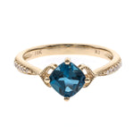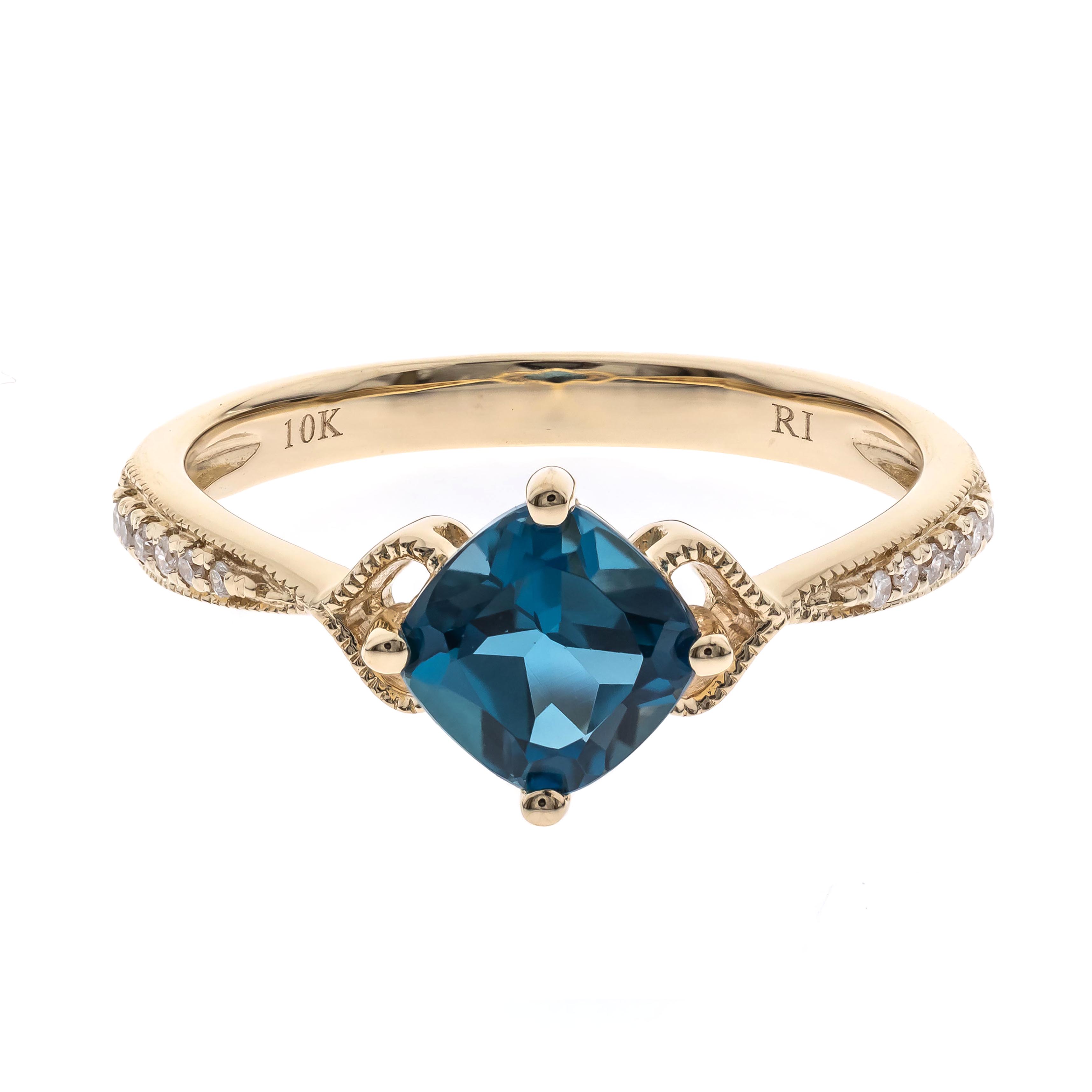 Decorate yourself in elegance with this Ring is crafted from 10-karat yellow Gold by Gin & Grace. This Ring is made up of Cushion-Cut Brazilian London Blue Topaz (1 pcs) 1.18 carat and round-cut diamond (12 Pcs) 0.05 Carat. This Ring is weight 1.89 grams. This delicate Ring is polished to a high finish shine.