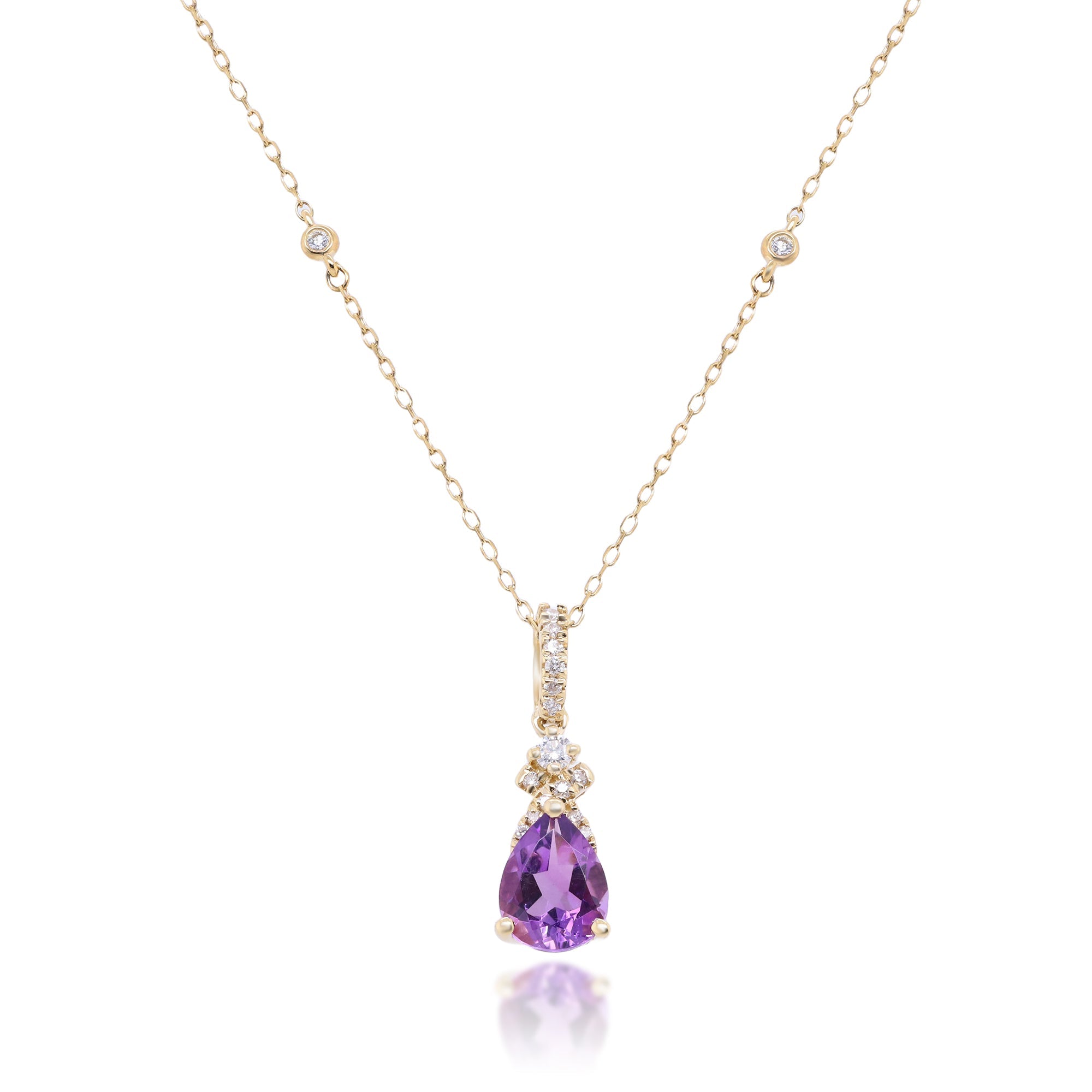 Decorate yourself in elegance with this Pendant is crafted from 14-karat Yellow Gold by Gin & Grace. This Pendant is made up of 8x6 mm Pear-Cut (1 pcs) 0.98 carat Brazilian Amethyst and Round-cut White Diamond (17 Pcs) 0.13 Carat. This Pendant is weight 1.77 grams. This delicate Pendant is polished to a high finish shine.