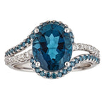 Decorate yourself in elegance with this Ring crafted from 10-karat white Gold by Gin & Grace. This Ring is made up of 9*11 mm Brazilian London Blue Topaz Oval-cut (1 pcs) 4.40 and Round-cut Diamond (54 pcs) 0.43 Carat. This Ring weighs 2.76 grams. This delicate Ring is polished to a high finish shine.