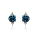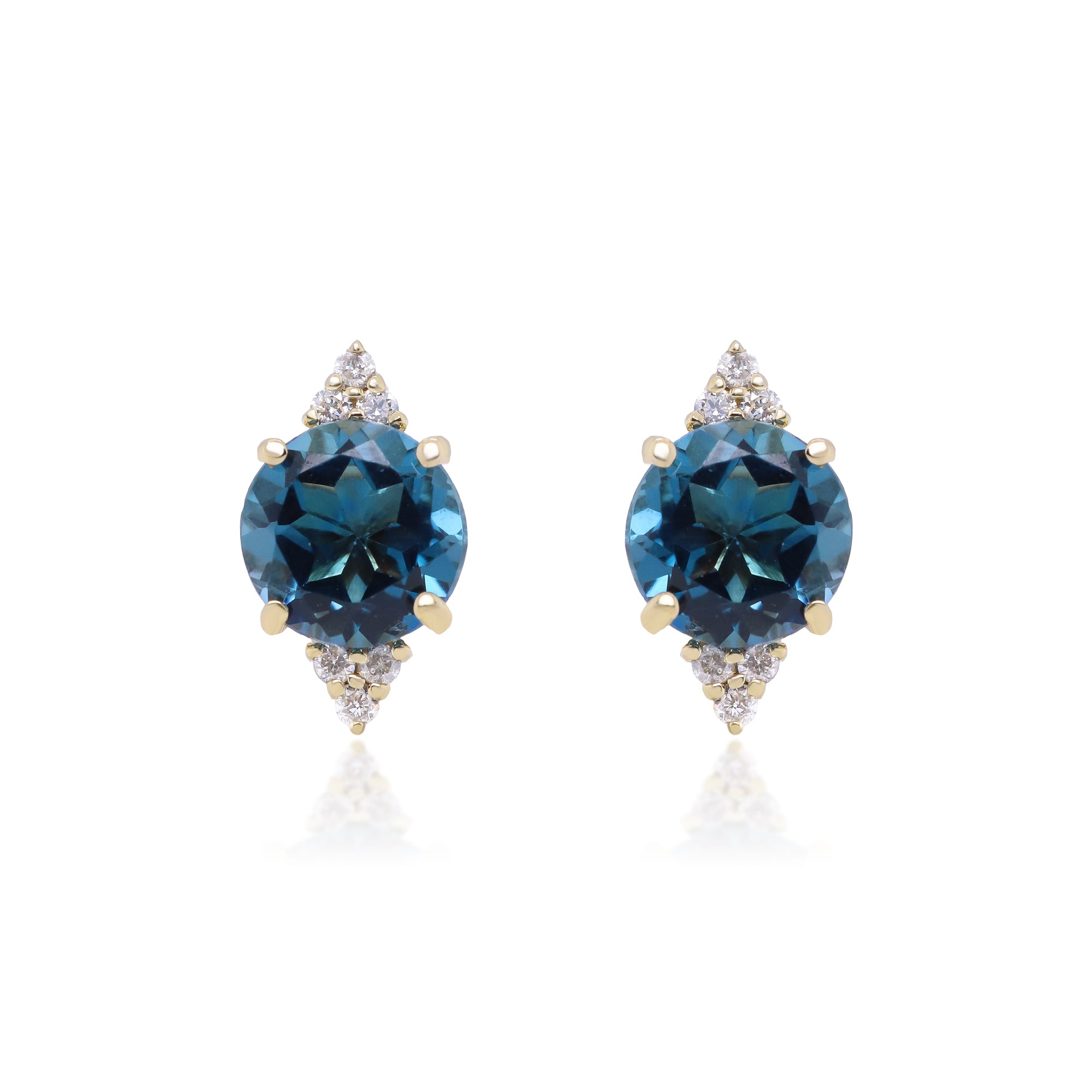 Decorate yourself in elegance with this Earring is crafted from 10-karat Yellow Gold by Gin & Grace. This Earring is made up of 6.0 mm Round-cut Brazilian London Blue Topaz (2 Pcs) 1.94 carat and Round-cut White Diamond (12 Pcs) 0.07 Carat. This Earring is weight 1.04 grams. This delicate Earring is polished to a high finish shine.