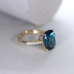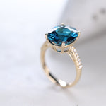 Decorate yourself in luxury with this Gin & Grace ring. The 14k Yellow Gold jewelry boasts a Cushion Prong Setting Brazilian London Blue Topaz stone (1pcs) 6.68 Carat, and Round-Cut Prong Setting (14pcs) 0.14 Carat white diamond accent stones for a glimmering design. This ring weighs 2.71 grams. Natural Diamonds with good quality I1-I2.One of a kind Crafted with 14K Yellow Gold , this delicate Ring is polished to a high finish shine.