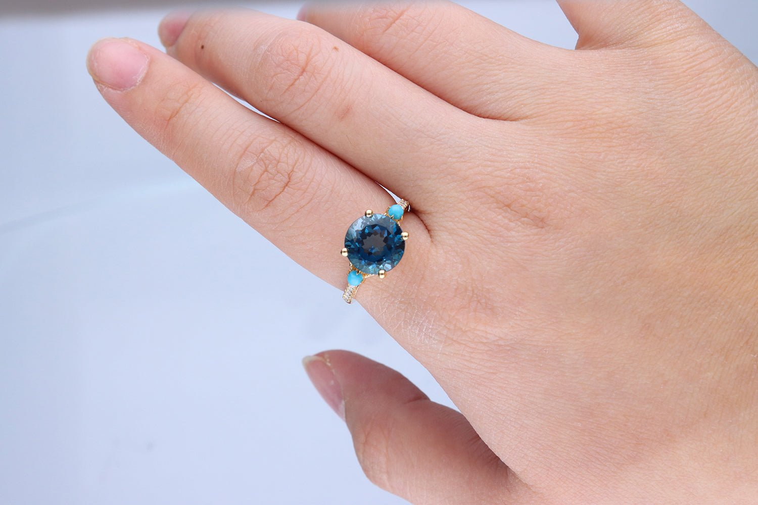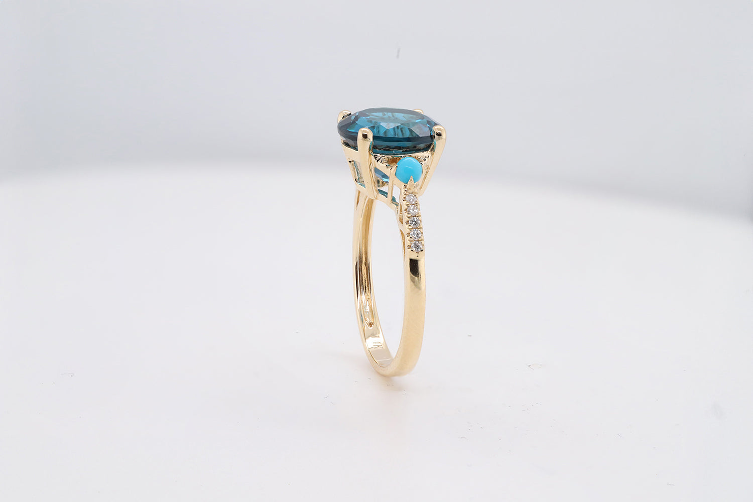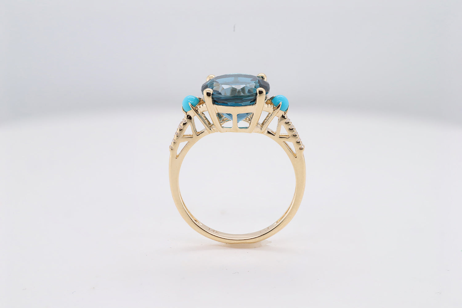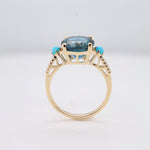 Stunning, timeless, and classy eternity Unique ring. Decorate yourself in luxury with this Gin & Grace ring. The 14k Yellow Gold jewelry boasts Round-Cut Prong Setting Genuine Brazilian London Blue Topaz (1 pcs) 4.92 Carat, Genuine Turquoise (2 Pcs) 0.18 Carat, Natural White Round cut Diamond (10 Pcs) 0.05 Carat accent stones for a lovely design. This ring weighs 2.62 grams. Crafted with 14k Yellow Gold, this delicate Ring is polished to a high finish shine.