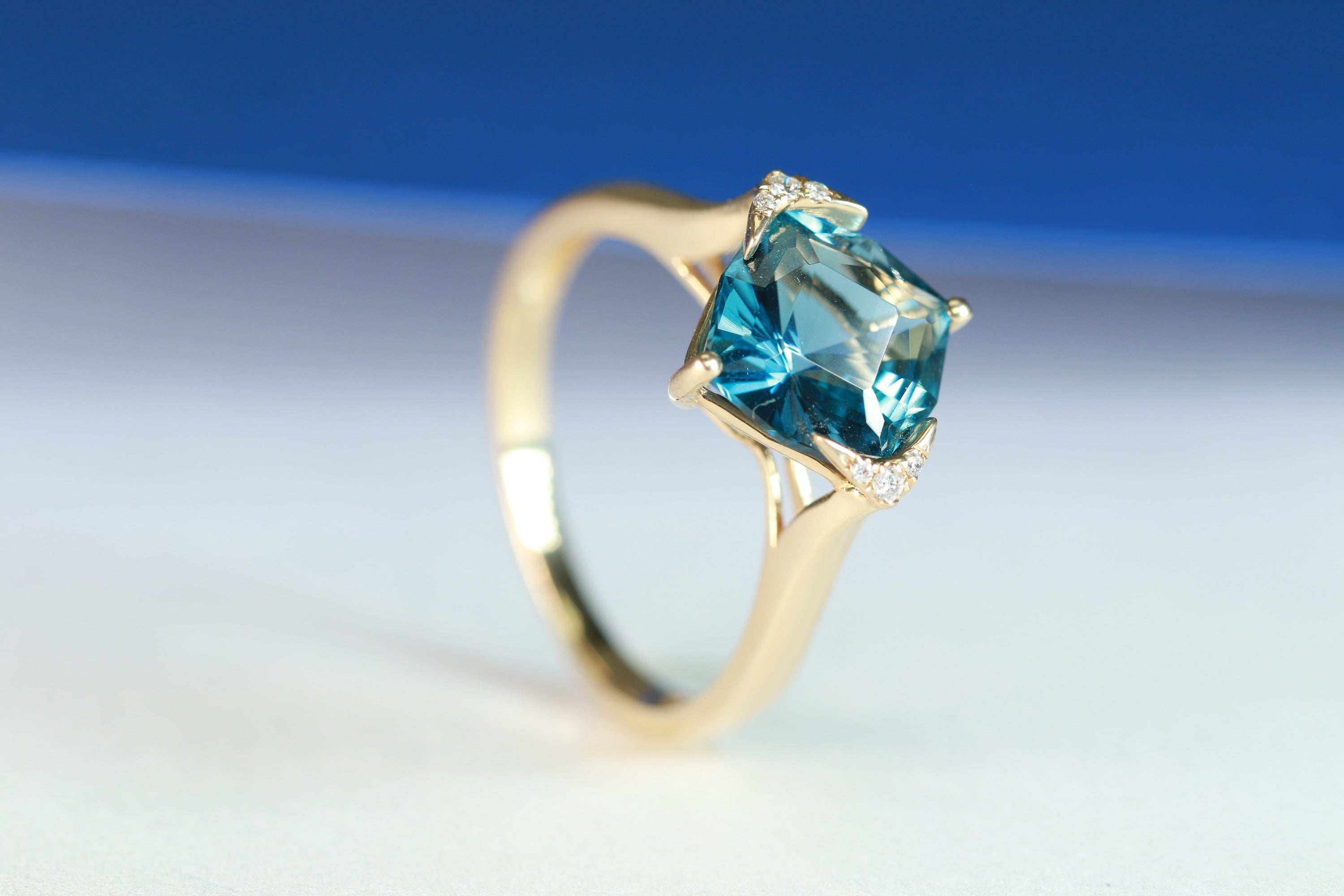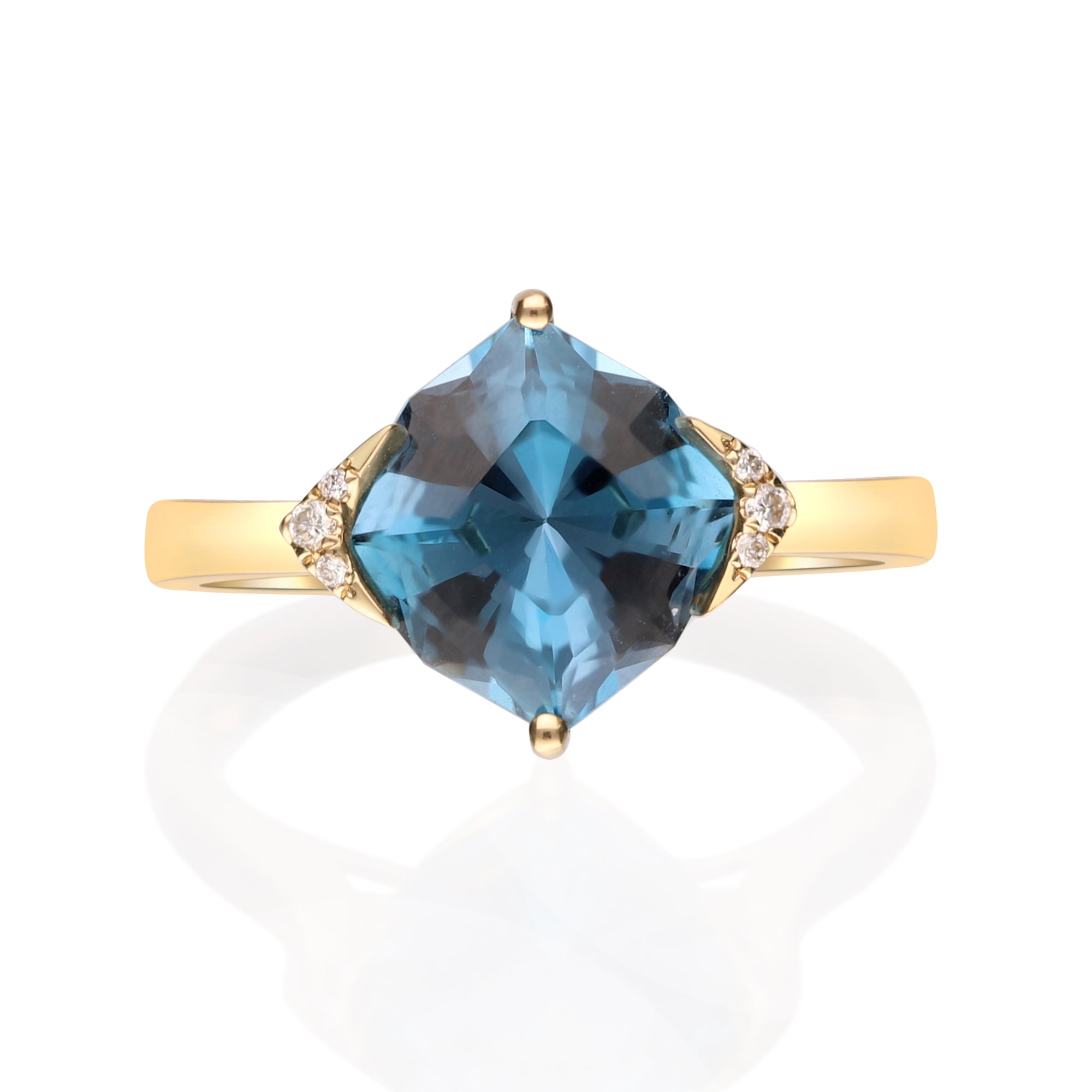 Stunning, timeless and classy eternity Unique Ring. Decorate yourself in luxury with this Gin & Grace Ring. The 14K Yellow Gold jewelry boasts Cushion-Cut Prong Setting Genuine Brazilian London Blue Topaz (1 pc) 3.16 Carat, along with Natural Round cut white Diamond (6 Pcs) 0.03 Carat, accent stones for a lovely design. This Ring is weight 2.13 grams. Crafted with 14K Yellow Gold, this delicate Ring is polished to a high finish shine.