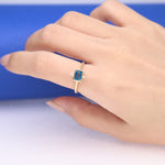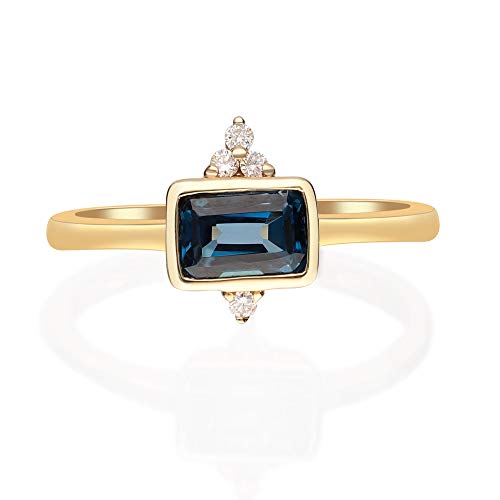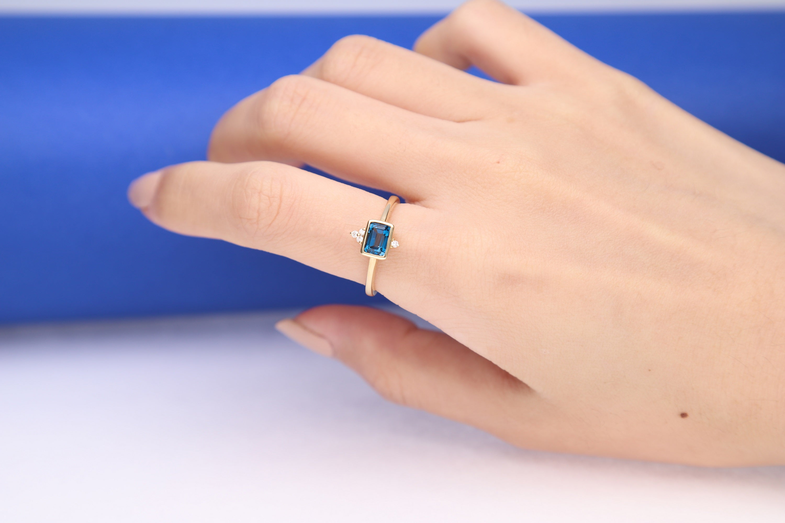 Stunning, timeless and classy eternity Unique Ring. Decorate yourself in luxury with this Gin & Grace Ring. The 14k Yellow Gold jewelry boasts Emerald-Cut Basel Setting Genuine Brazilian London Blue Topaz (1 pc) 0.99 Carat, along with Natural Round Cut white Diamond (4 Pcs) 0.04 Carat, accent stones for a lovely design. This Ring is weight 2.15 grams. Crafted with 14k Yellow Gold, this delicate Ring is polished to a high finish shine.