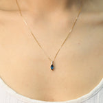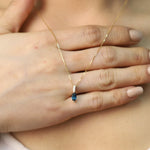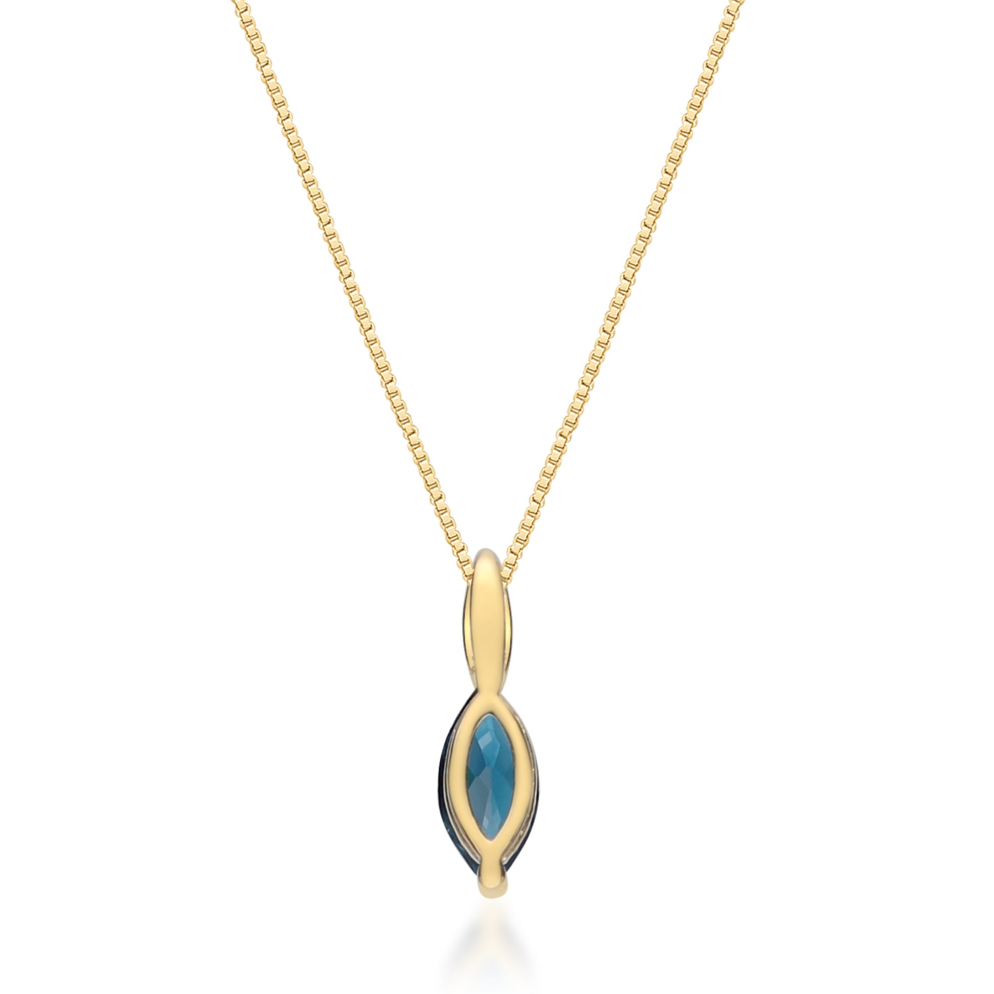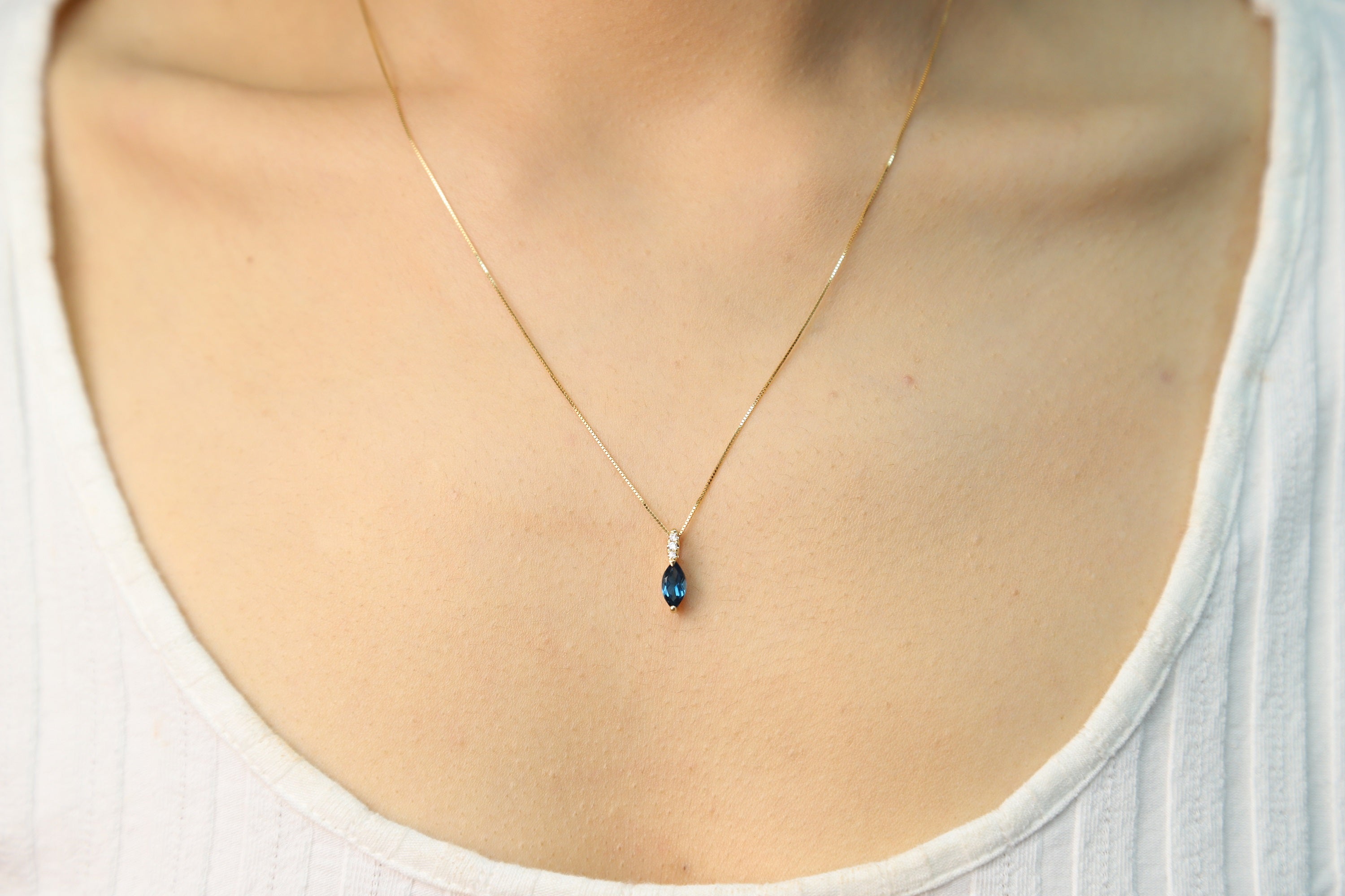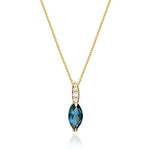 Decorate yourself in elegance with this Pendant is crafted from 14-karat Yellow Gold by Gin & Grace Pendant. This Pendant is made up of 8x4 mm Marquise-Cut Prong setting Brazilian London Blue Topaz (1 Pcs) 0.63 Carat and Round-Cut Prong setting White Diamond (3 Pcs) 0.03 Carat. This Pendant is weight 0.44 grams. The gorgeous Pendant hangs from a 18-inch wheat chain. This delicate Pendant is polished to a high finish shine.Â