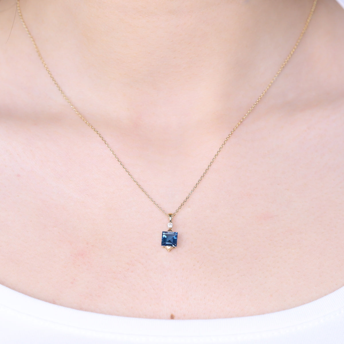 Decorate yourself in elegance with this Pendant is crafted from 10-karat Yellow Gold by Gin & Grace. This Pendant is made up of 6.0 mm Square-Cut Brazilian London Blue Topaz (1 pcs) 1.37 carat and Round-cut White Diamond (1 Pcs) 0.04 Carat. This Pendant is weight 1.74 grams. This delicate Pendant is polished to a high finish shine.