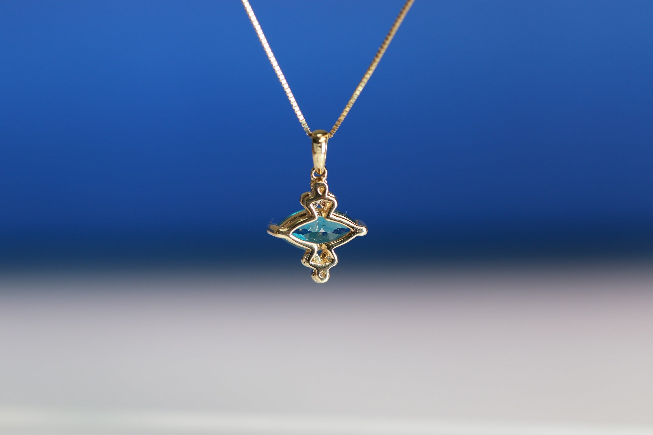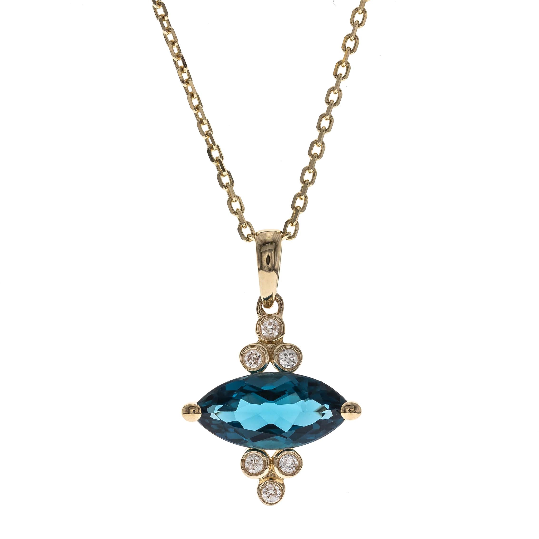 Decorate yourself in elegance with this Pendant is crafted from 14-karat Yellow Gold by Gin & Grace. This Pendant is made up of 5*10 mm Brazilian London Blue Topaz marquise-cut (1 pcs )1.24 carat and Round-cut Diamond (6 Pcs) 0.05 carat. This Pendant is weight 2.38 grams. This delicate Pendant is polished to a high finish shine.