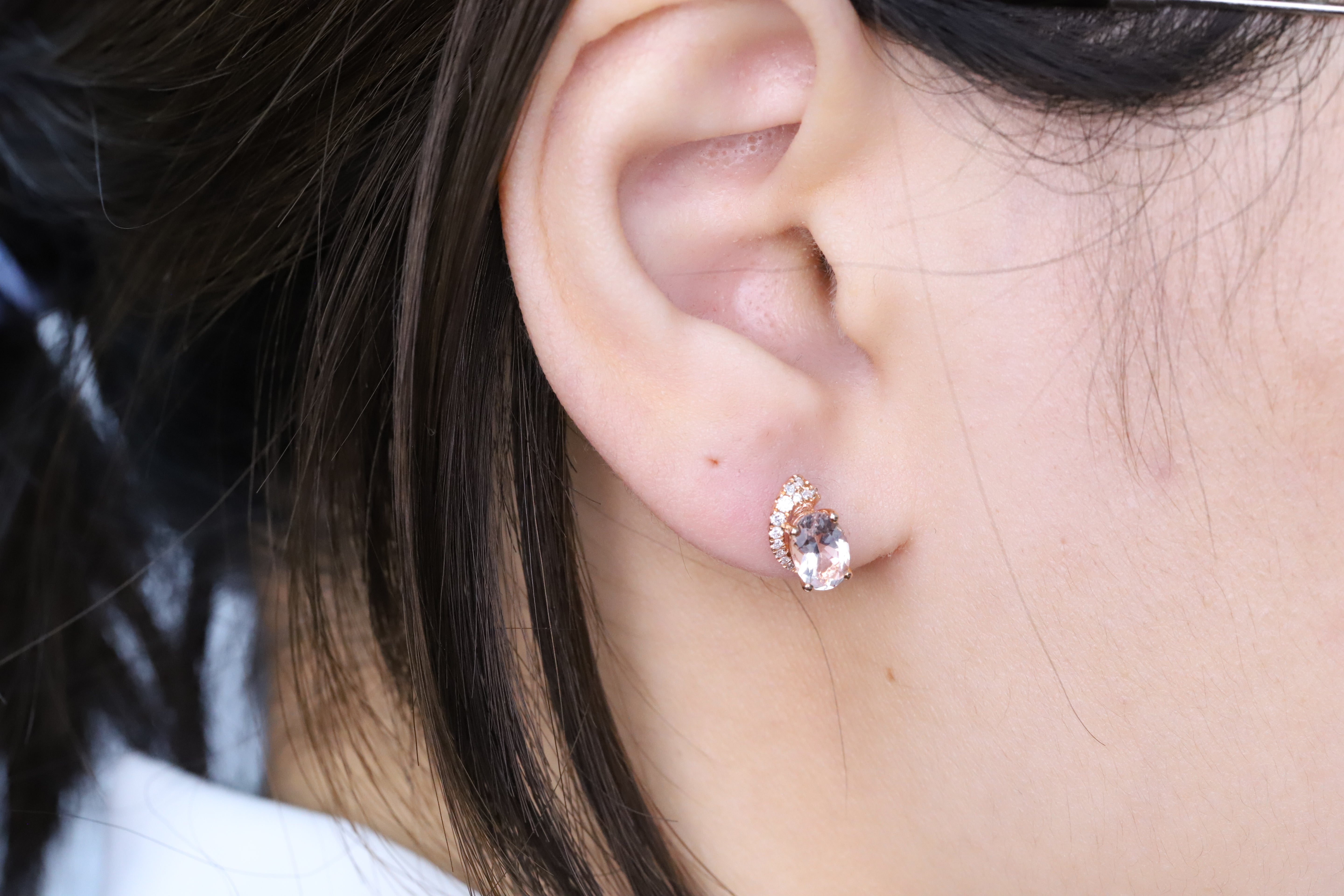 Decorate yourself in elegance with this Earring is crafted from 10K Rose Gold by Gin & Grace Earring. The jewelry boasts Oval-Cut cabochon setting white color Natural Morganite (2 pcs) 1.27 Carat and Round-Cut prong setting Diamond (24 pcs) 0.11 Carat. This Earring is weight 0.97 grams. This delicate Earring is polished to a high finish shine. Simple Stud clasps keep these earrings securely fastened.