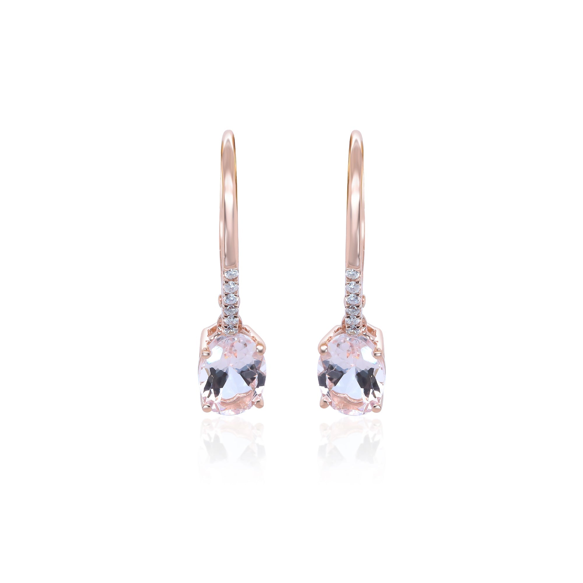 Decorate yourself in elegance with this Earring is crafted from 14K Rose Gold by Gin & Grace Earring. This Earring is made up of Oval-Cut prong setting Natural Madagascar Morganite (2 pcs) 1.41 Carat and Round-Cut prong setting Diamond (12 pcs) 0.06 Carat. This Earring is weight 1.37 grams. This delicate Earring is polished to a high finish shine. Simple lever back clasps keep these earrings securely fastened