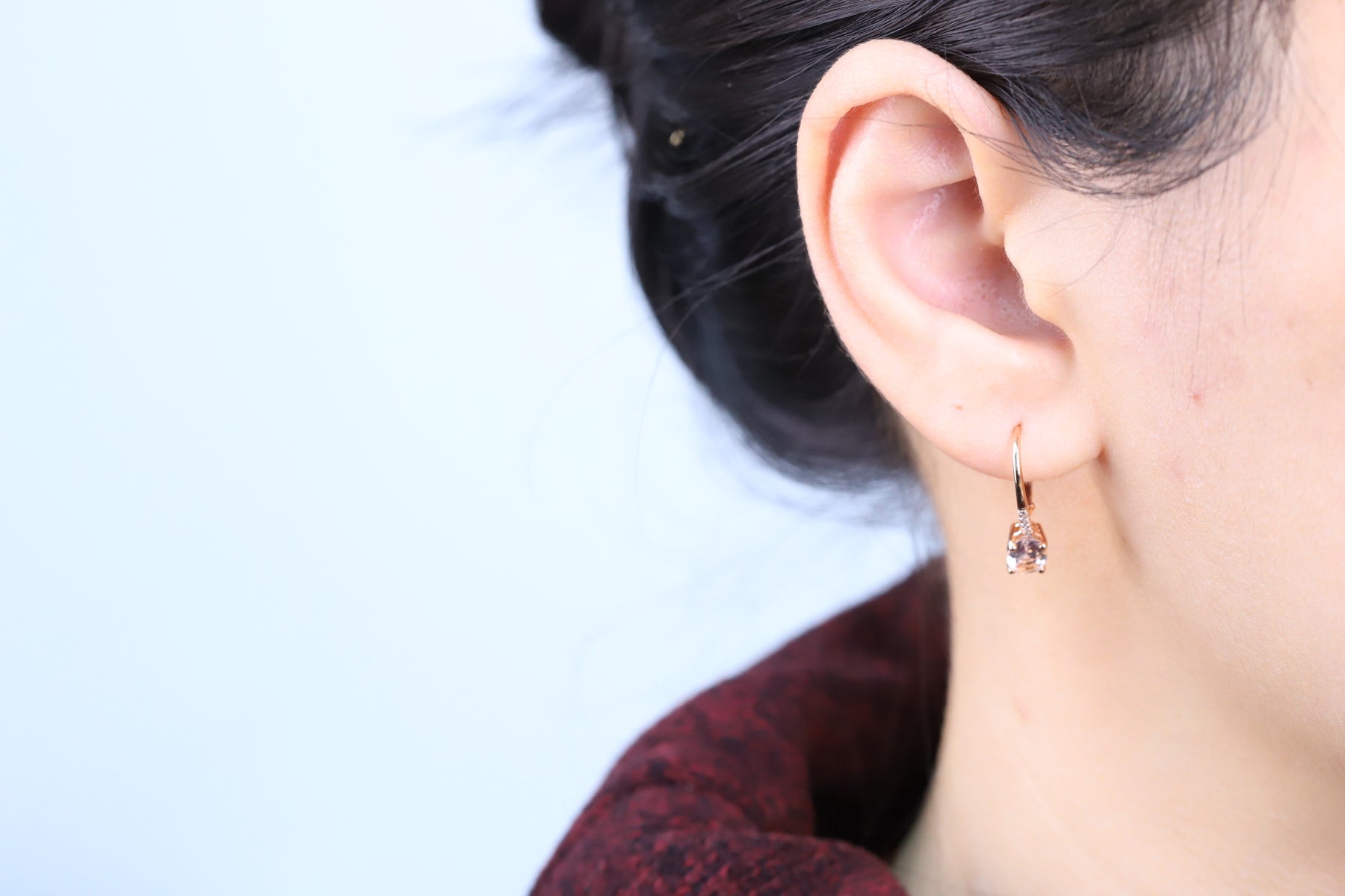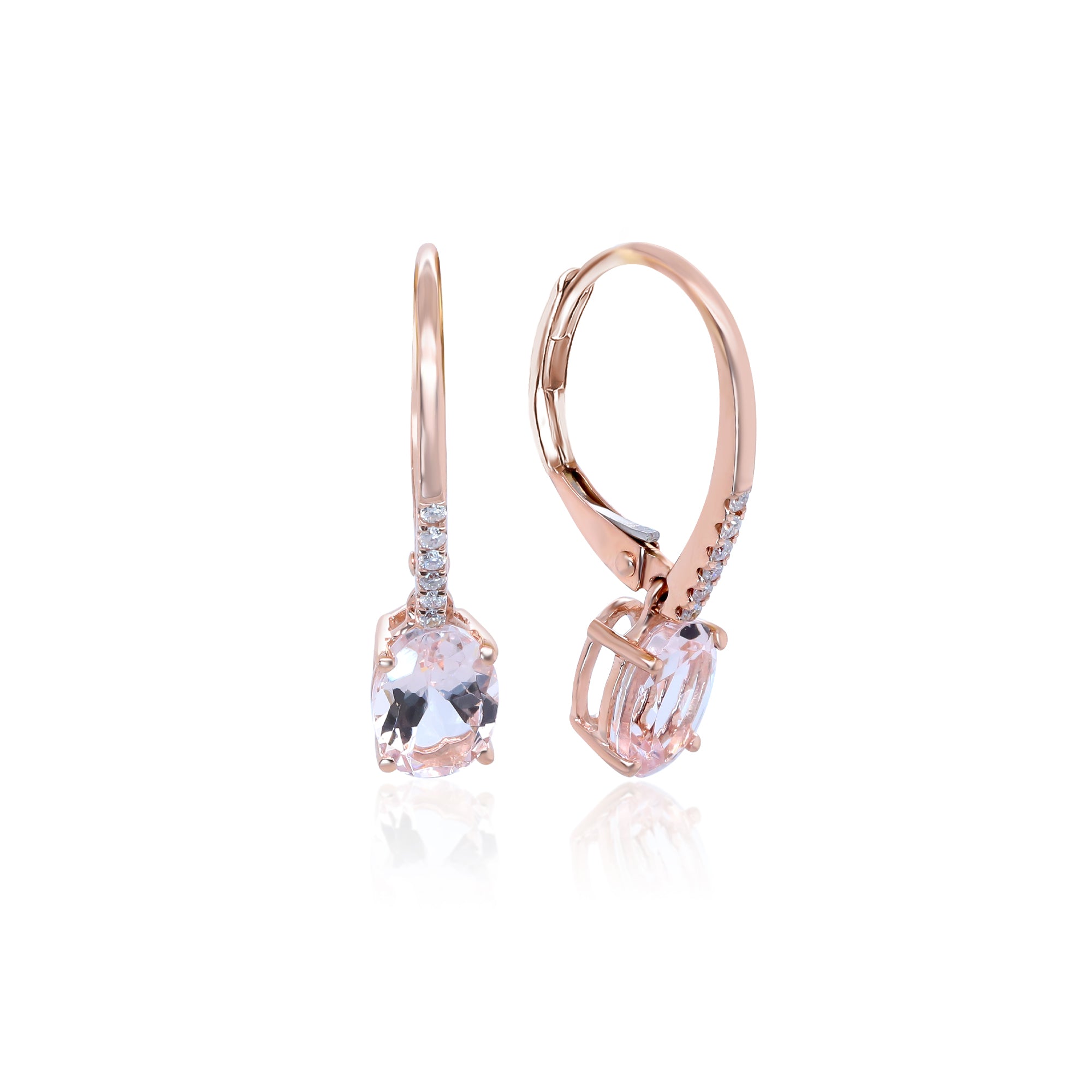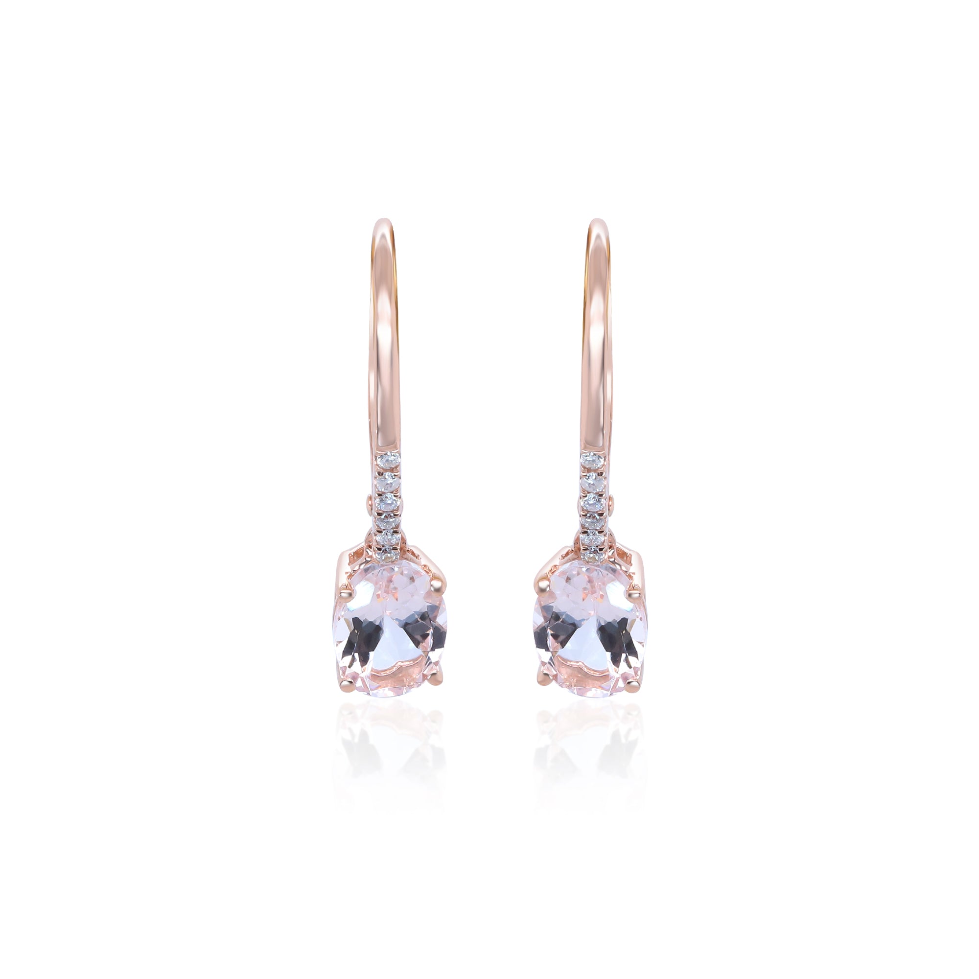 Decorate yourself in elegance with this Earring is crafted from 14K Rose Gold by Gin & Grace Earring. This Earring is made up of Oval-Cut prong setting Natural Madagascar Morganite (2 pcs) 1.41 Carat and Round-Cut prong setting Diamond (12 pcs) 0.06 Carat. This Earring is weight 1.37 grams. This delicate Earring is polished to a high finish shine. Simple lever back clasps keep these earrings securely fastened