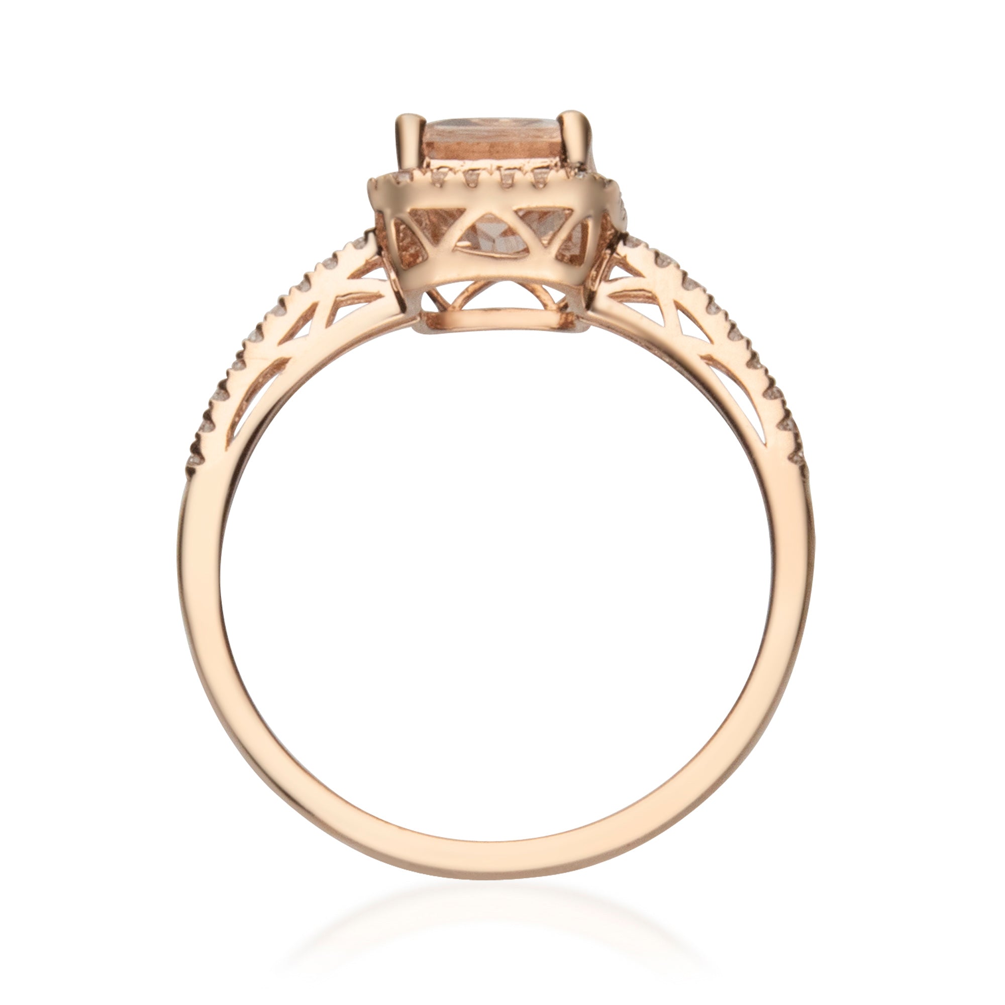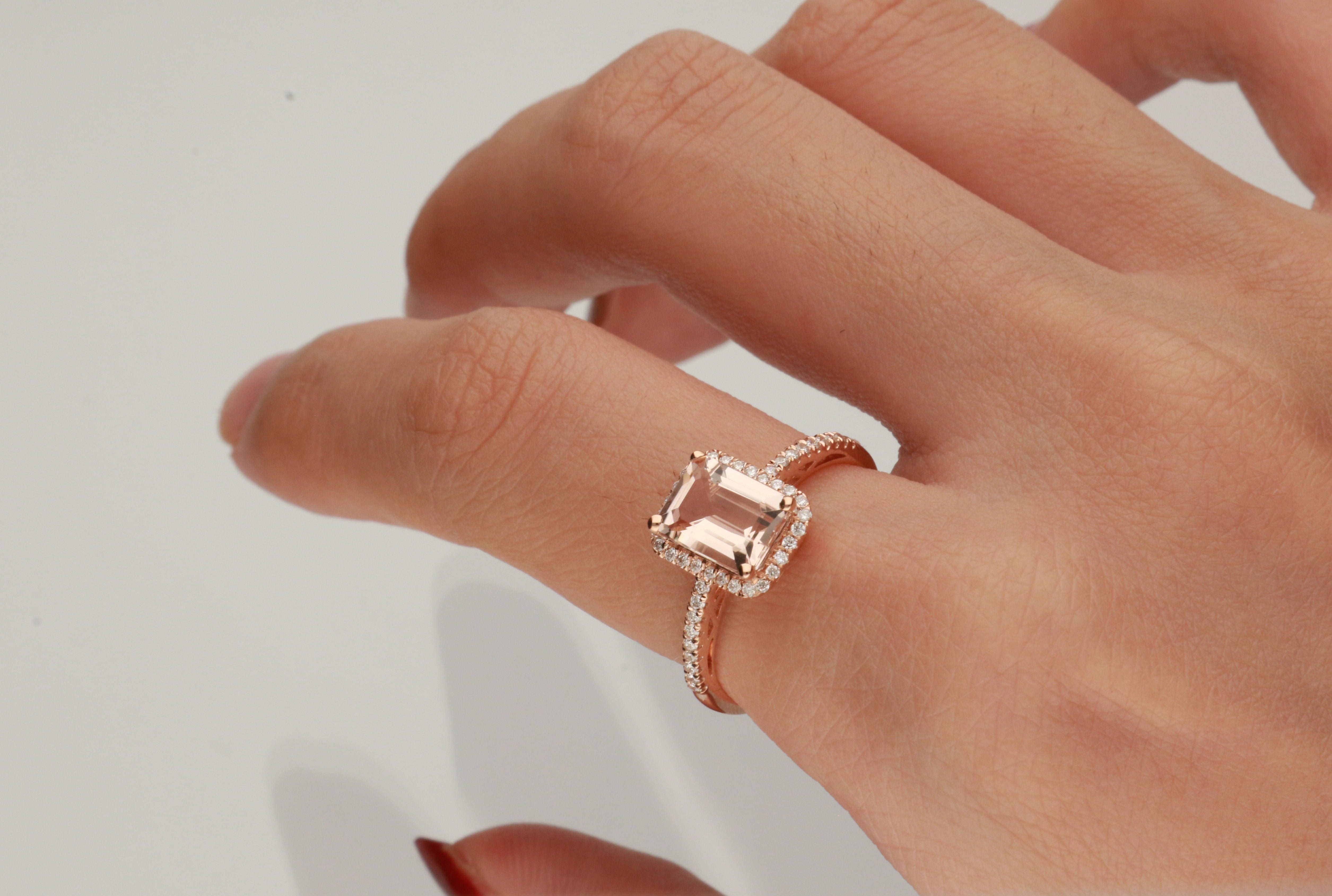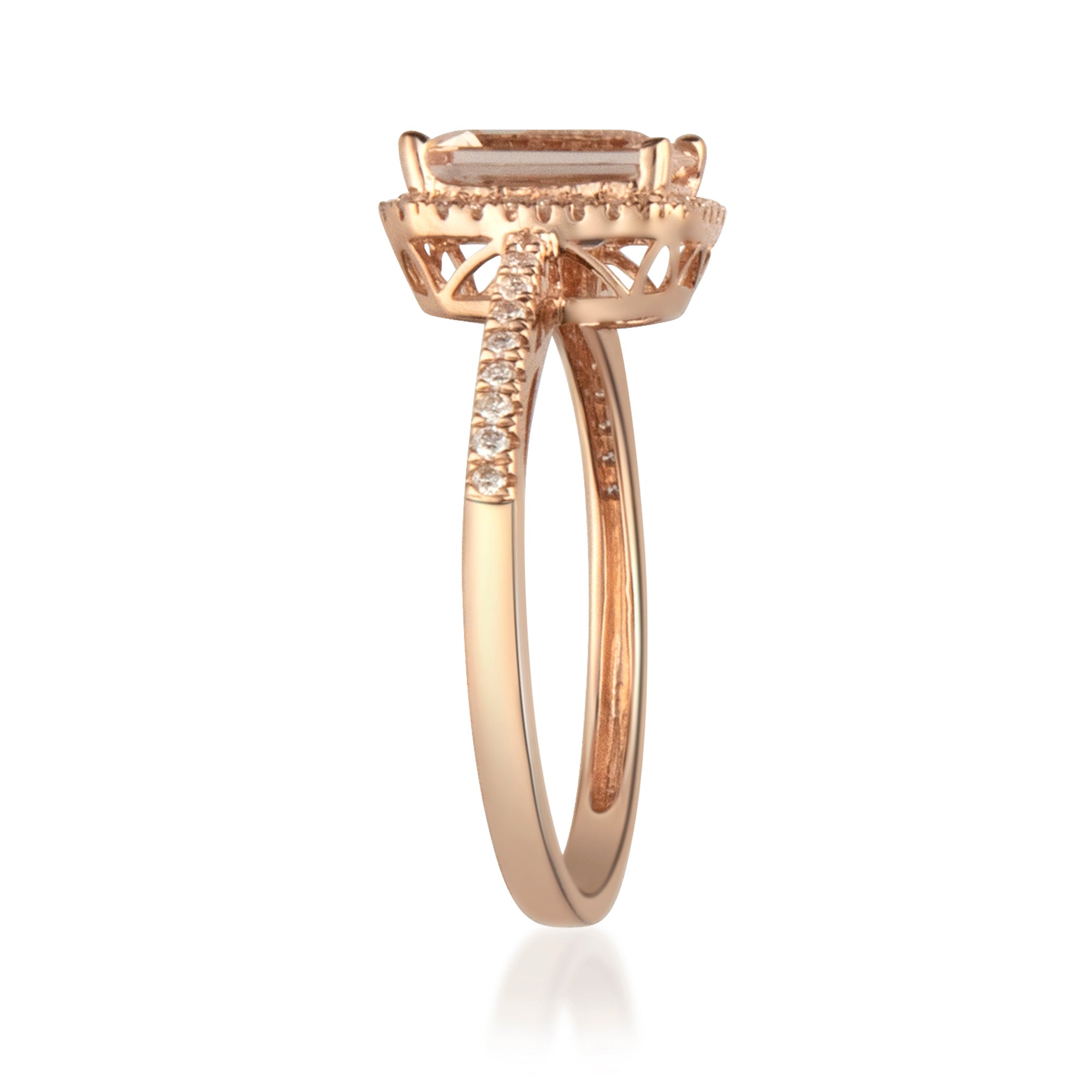 Decorate yourself in elegance with this Ring is crafted from 14-karat Rose Gold by Gin & Grace. This Ring is made up of 6*8 mm Emerald-cut (1 pcs) 1.380 carat Madagascar Morganite and Round Cut Diamond (46 Pcs) 0.191 Carat. This Ring is weight 2.363 grams. This delicate Ring is polished to a high finish shine.
