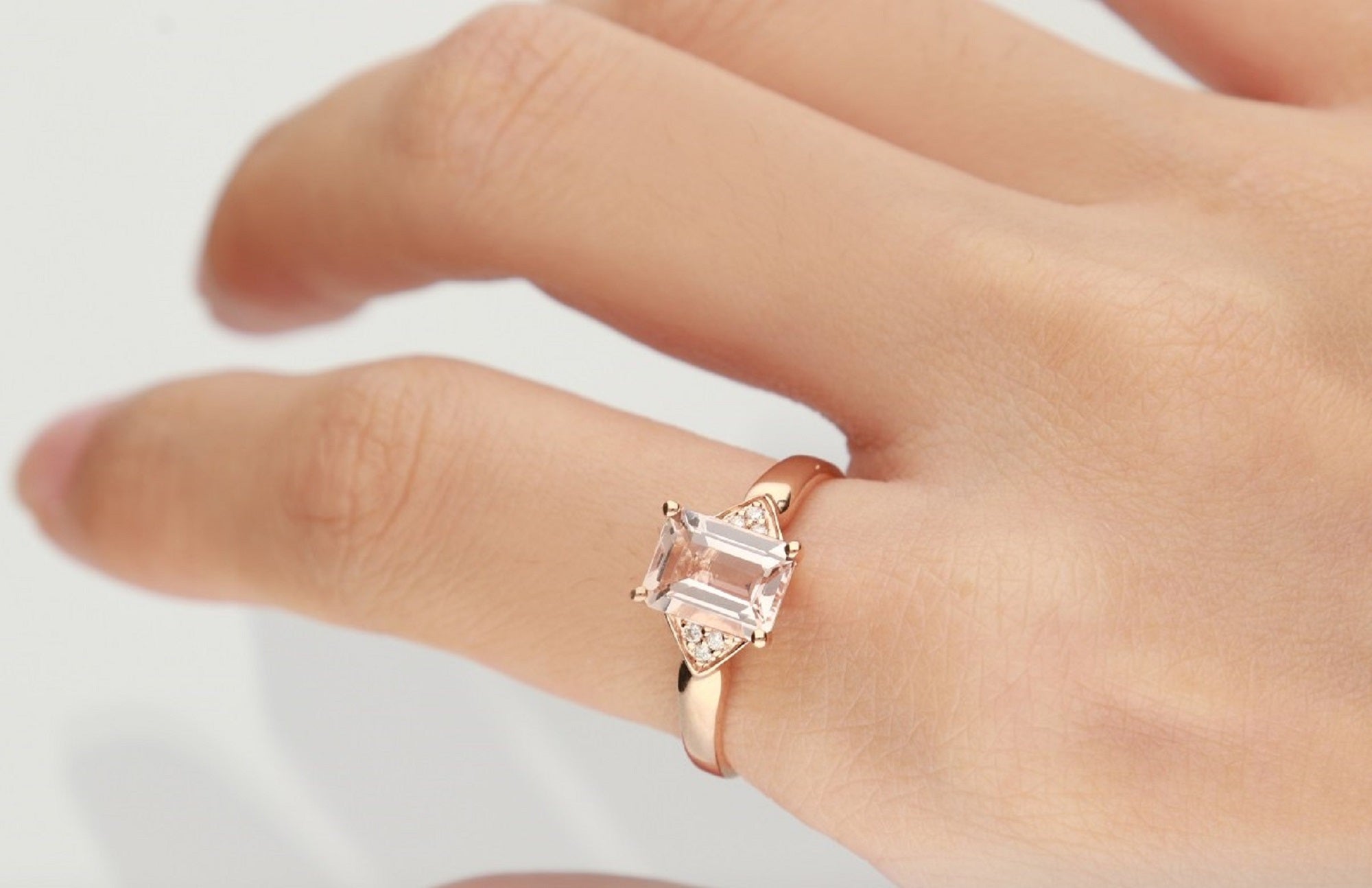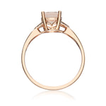 Decorate yourself in elegance with this Ring is crafted from 14-karat Rose Gold by Gin & Grace. This Ring is made up of 6x8 mm Emerald-Cut (1 pcs) 1.28 carat Madagascar Morganite and Round-cut White Diamond (6 Pcs) 0.04 Carat. This Ring is weight 1.80 grams. This delicate Ring is polished to a high finish shine.
