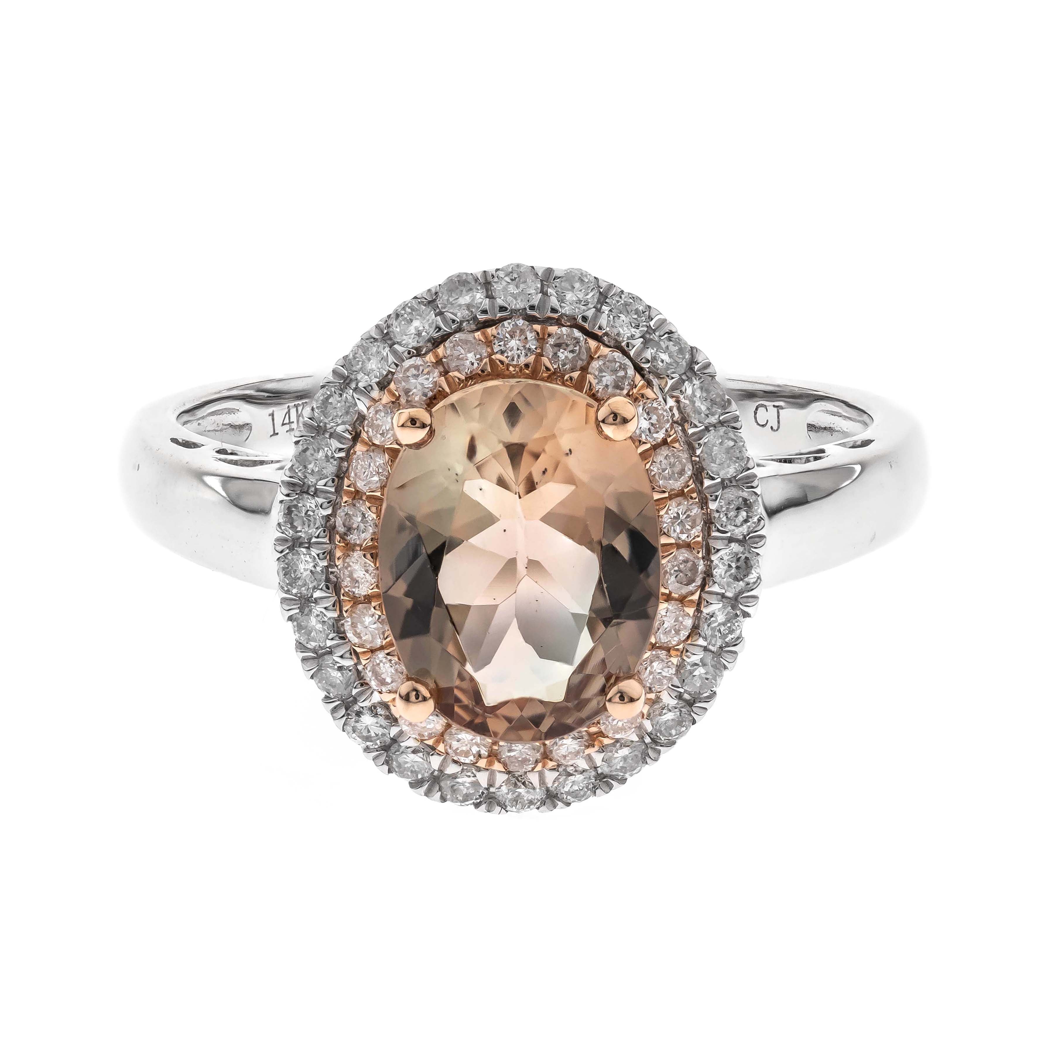 Stunning, timeless and classy eternity Unique Ring. Decorate yourself in luxury with this Gin & Grace Ring. The 14k Two Tone Gold jewelry boasts Oval-Cut Prong Setting Genuine Madagascar Morganite (1 pcs) 1.62 Carat, along with Natural Round cut white Diamond (48 Pcs) 0.34 Carat, accent stones for a lovely design. This Ring is weight 3.65 grams. Crafted with 14k Two Tone Gold, this delicate Ring is polished to a high finish shine.