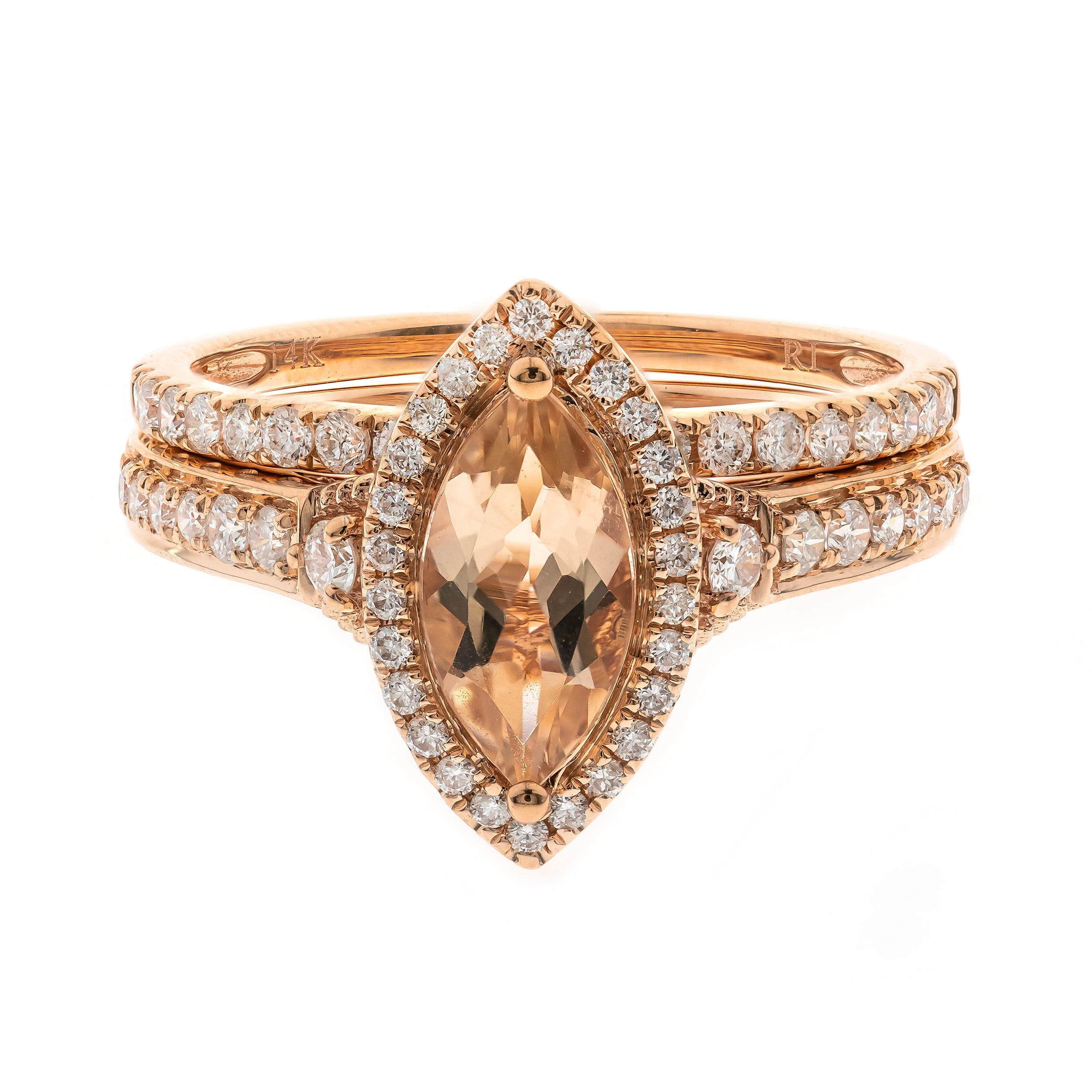 Stunning, timeless and classy eternity engagement ring. Decorate yourself in luxury with this Gin & Grace ring. The 14k Rose Gold jewelry boasts 5X10 Marquise-Cut Prong Setting Genuine Madagascar Morganite (1pcs) 0.93 Carat, and Round-Cut Prong Setting Diamond (59 pcs) 0.55 Carat accent stones for a lovely design. This ring is weight 3.81 grams. Crafted with 14k Rose Gold, this delicate Ring is polished to a high finish shine.
