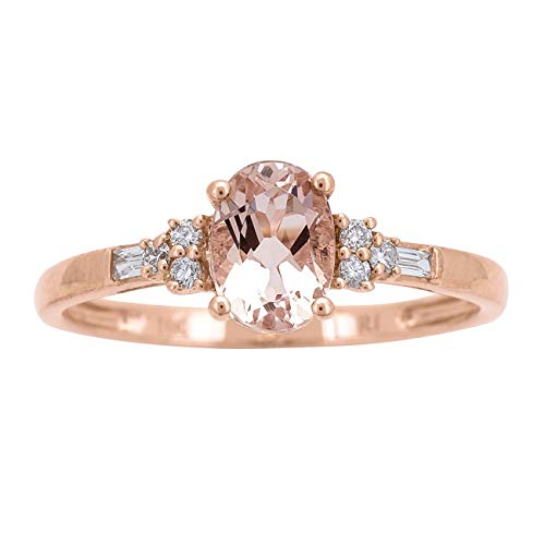Made of an oval-cut Genuine Madagascar Morganite center with baguette-cut Gin& Grace Natural diamonds on each side, this ring is the perfect way to show off your style. This piece is the perfect way to treat yourself to a perfectly designed ring that comes off as elegant and sophisticated. Gemstone shapes: Oval-cut One Prong-set Oval-cut Genuine Madagascar Morganite measures 5 mm wide x 7 mm long Gemstone weight: 3/4 carats Total gemstone weight: 3/4 carats Diamonds:2 Diamond cut: Natural Baguette Diamond measurements: Each measure Free Diamond weight: 1/25 carat Color: G-H Clarity: I1-I2 Setting: Channel Diamonds:6 Diamond cut: Round Diamond measurements: Each measures 1 mm Diamond weight: 1/13 carat Color: G-H Clarity: I1-I2 Setting: Prong Metal: 10K Rose Gold Finish: High polish Metal weight: 1.27grams Ring setting dimensions: 18mm wide x 22 mm long x 4 mm deep Band dimensions: 2 mm wide