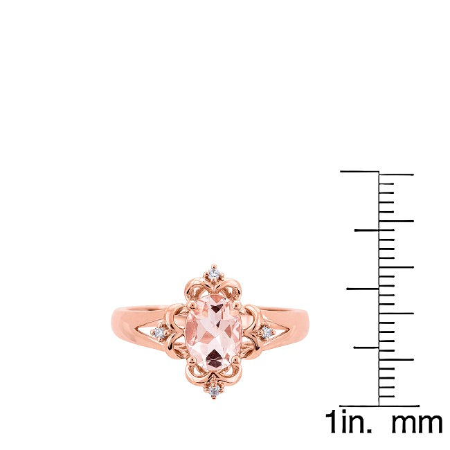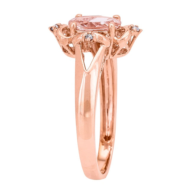 Accessorize your look with this beautiful and elegant ring. Crafted with 10-karat rose gold, this ring showcases an oval-cut Gin & Grace Genuine Madagascar Morganite center framed with a scrolling metal design with sparkling round cut Natural diamonds at each point. Center Stone: Oval-cut Genuine Madagascar Morganite gemstone Prong setting Pink color 1 1/16 carats 6 mm wide x 8 mm long Side Stones: 4 round-cut diamonds Prong setting Measure 1 mm each 1/25 carat TDW G-H color, I1-I2 clarity Metal Information and Dimensions: 10k rose gold High polish finish 2.55 gram metal weight 2 mm band width 18 mm wide x 22 mm long x 4 mm deep