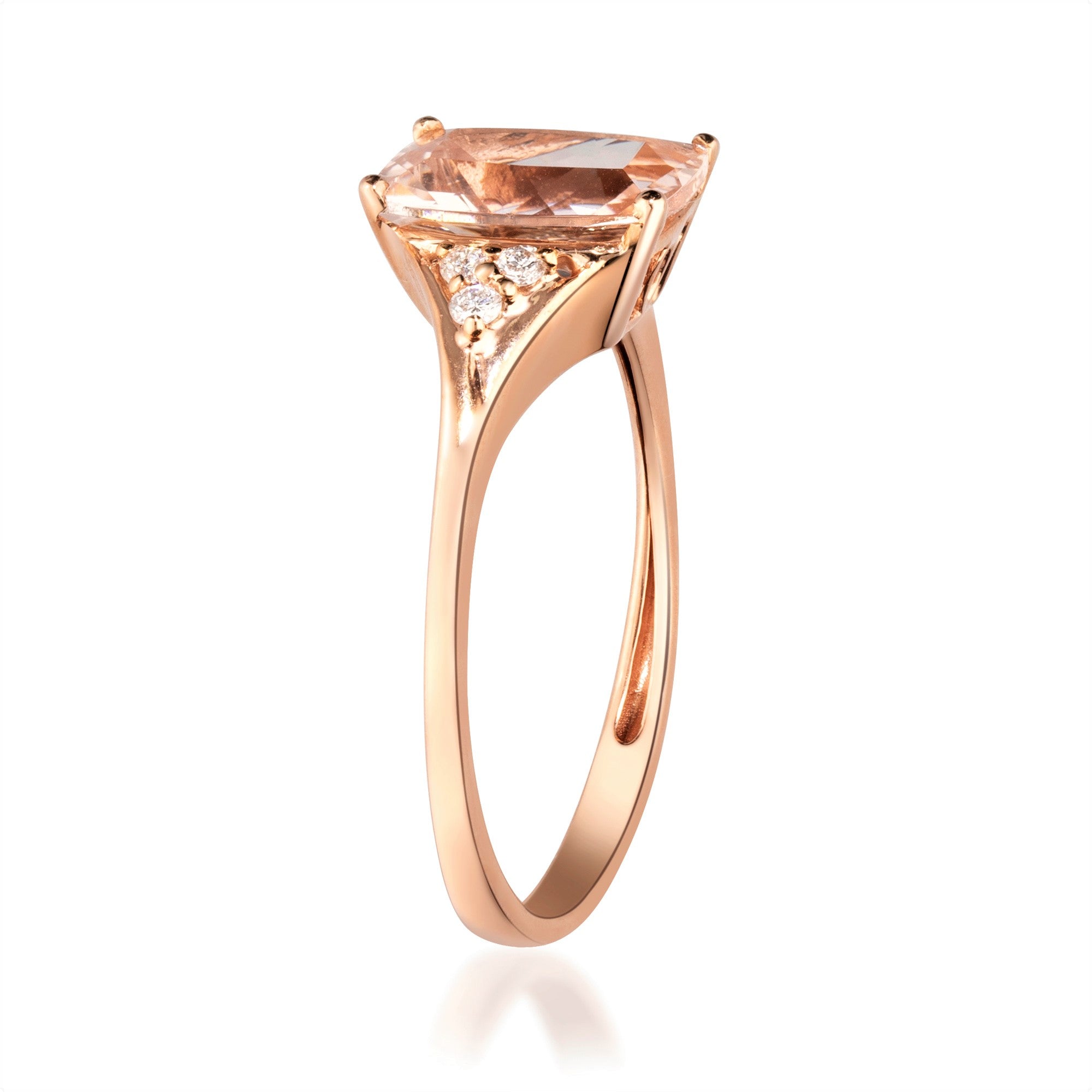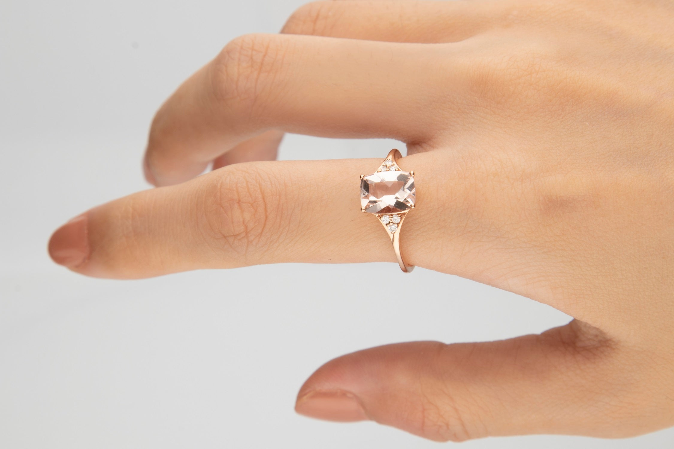 This elegant ring showcases a stunning cushion-cut Gin & Grace Genuine Madagascar Morganite gemstone in the center, accented with dazzling, natural diamonds. The 14-karat rose gold band is polished to a high shine, giving the ring a radiant finish. Gemstone colors: Genuine Madagascar Morganite Gemstone shapes: Cushion One prong-set cushion-cut Genuine Madagascar Morganite measures 7 mm wide x 9 mm long Gemstone weight: 2 1/9 carats Total gemstone weight: 2 1/9 carats Diamonds: Six (6) Diamond cut: Natural Round Diamond measurements: 1 mm Diamond weight: 1/10 carat Color: G-H Clarity: I1-I2 Setting: Prong Metal: 14k rose gold Finish: High polish Metal weight: 2.32 grams Ring setting dimensions: 19 mm wide x 24 mm long x 5 mm high Band dimensions: 2 mm wid9