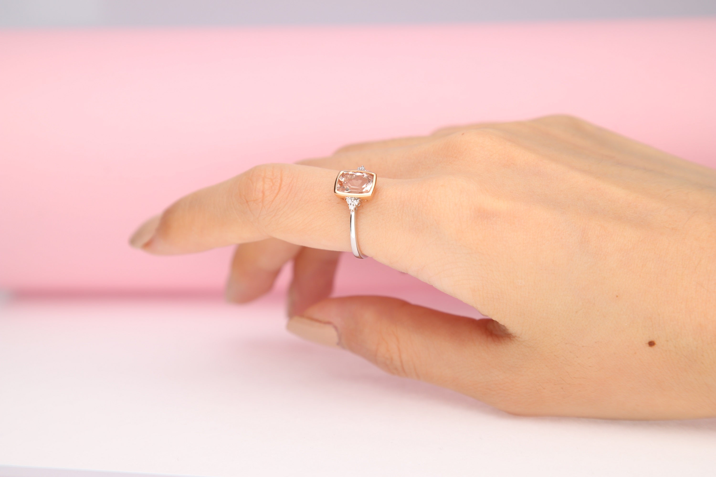 Stunning, timeless and classy eternity Unique Ring. Decorate yourself in luxury with this Gin & Grace Ring. The 14K Two Tone Gold jewelry boasts Cushion-Cut Prong Setting Genuine Morganite (1 pcs) 1.28 Carat, along with Natural Round cut white Diamond (6 Pcs) 0.04 Carat, accent stones for a lovely design. This Ring is weight 2.40 grams. Crafted with 14K Two Tone Gold, this delicate Ring is polished to a high finish shine.